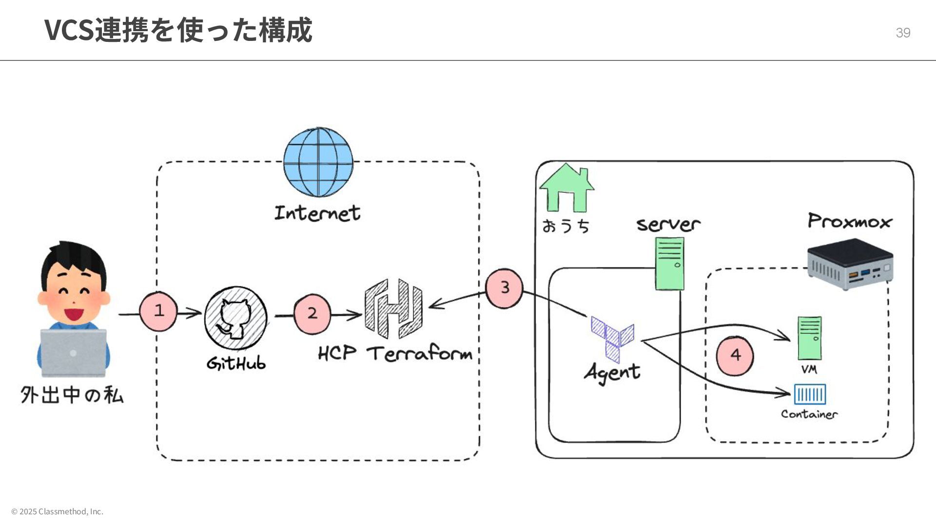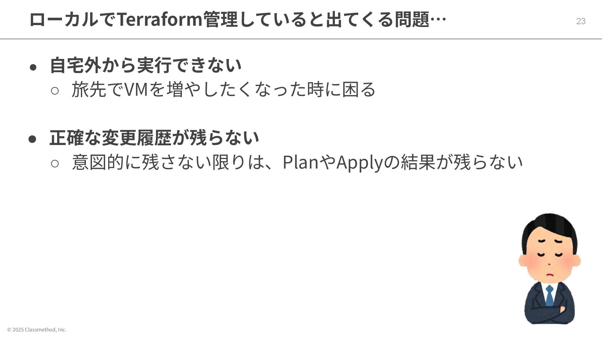 © 2025 Classmethod, Inc. ローカルでTerraform管理していると出てくる問題… 23 • ⾃宅外から実⾏できない ◦ 旅先でVMを増やしたくなった時に困る