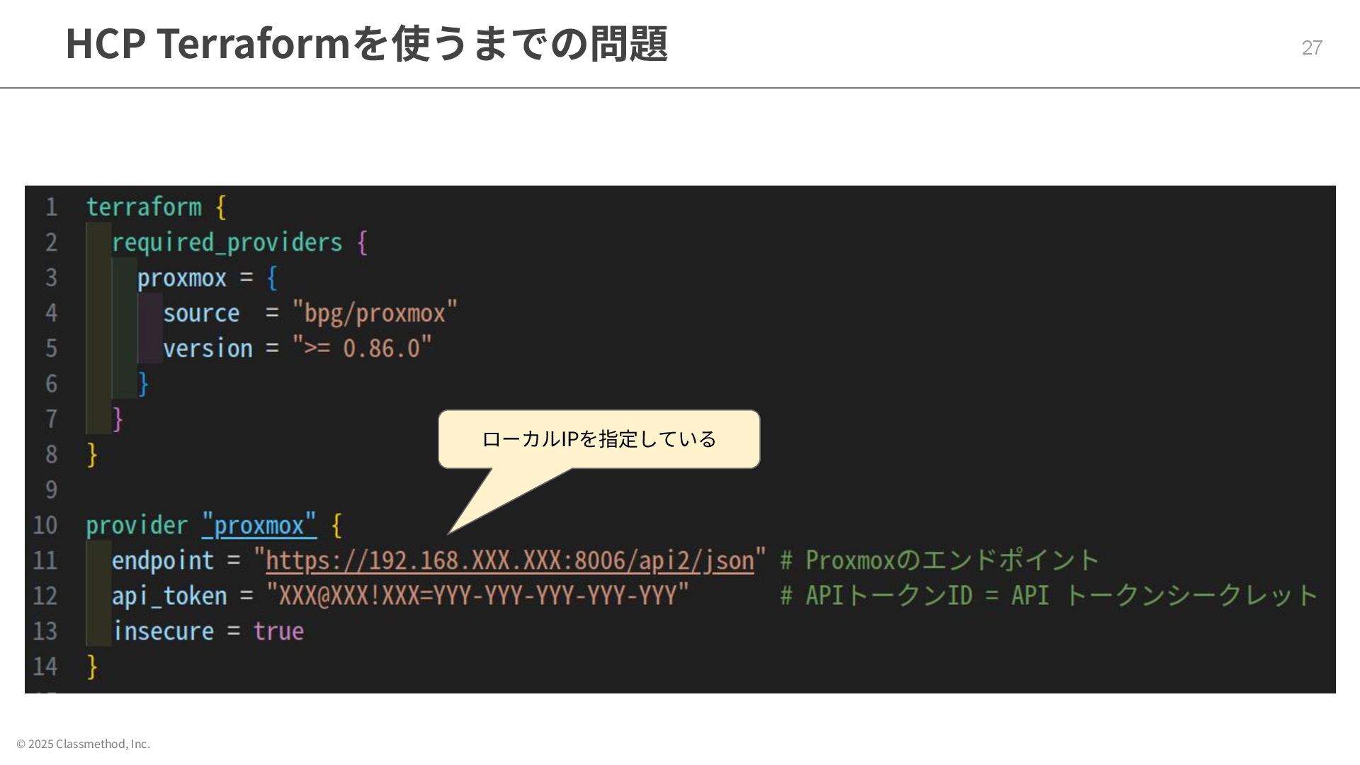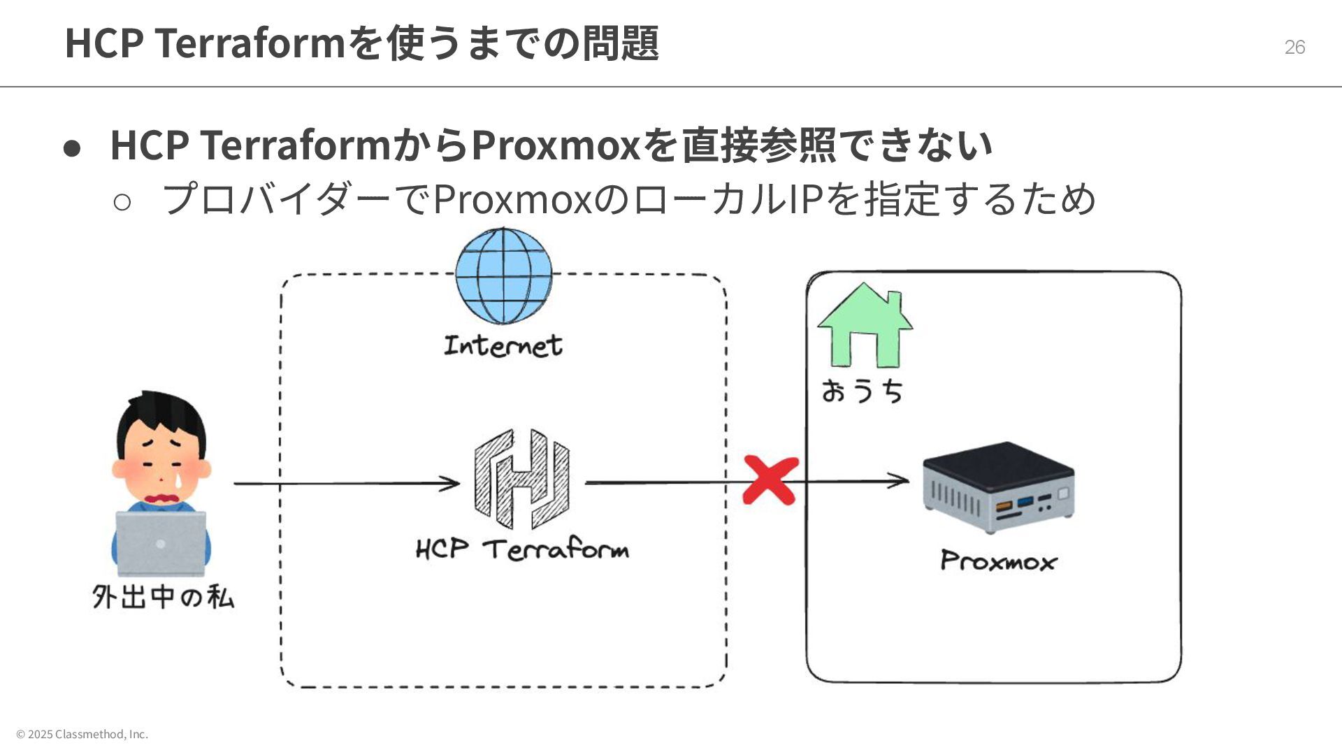 © 2025 Classmethod, Inc. HCP Terraformを使うまでの問題 26 • HCP TerraformからProxmoxを直接参照できない