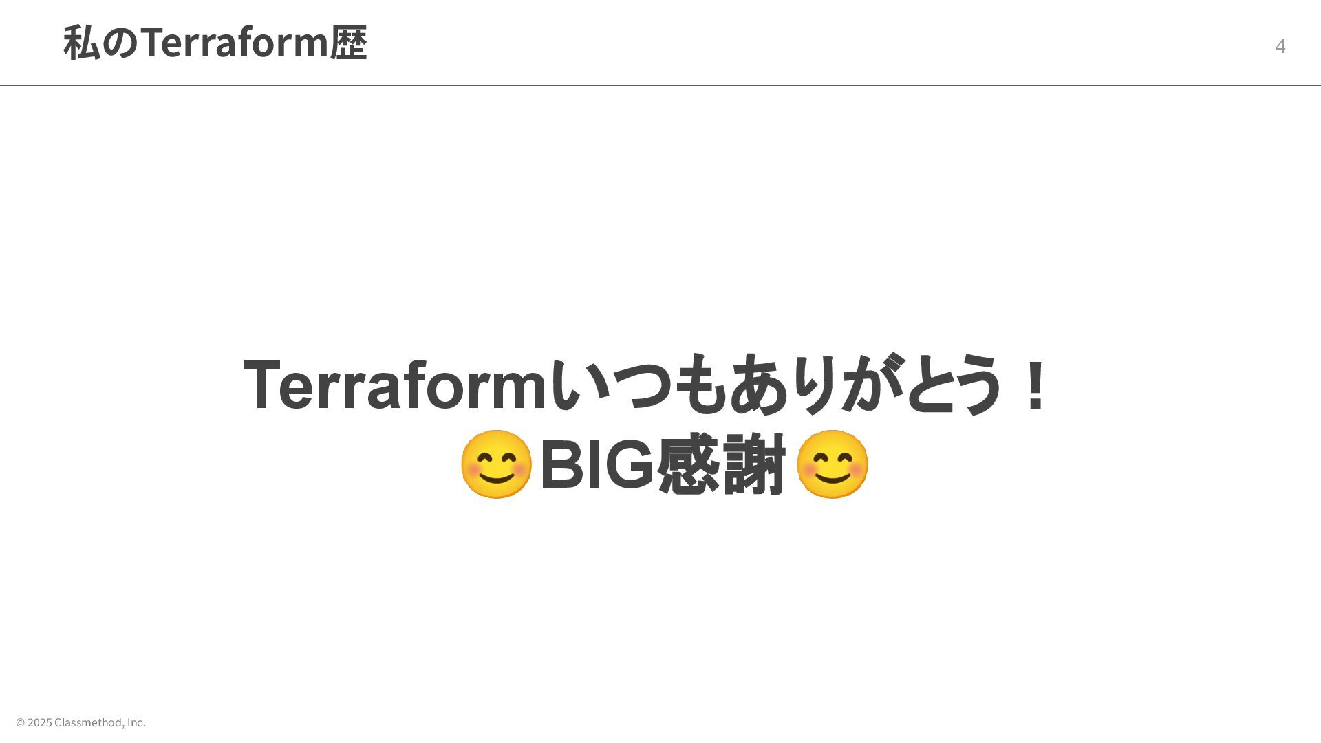 © 2025 Classmethod, Inc. 私のTerraform歴 4 Terraformいつもありがとう! 😊BIG感謝😊