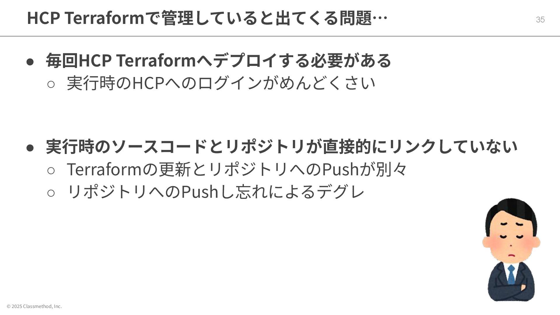 © 2025 Classmethod, Inc. HCP Terraformで管理していると出てくる問題… 35 • 毎回HCP Terraformへデプロイする必要がある
