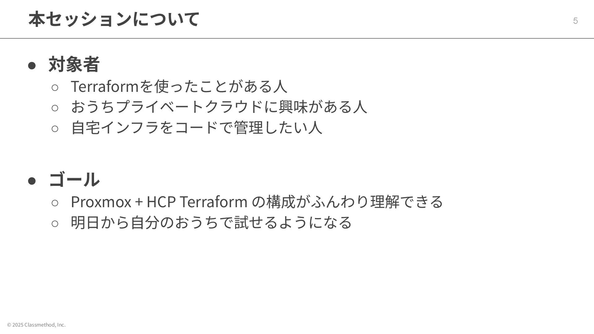 © 2025 Classmethod, Inc. 本セッションについて 5 • 対象者 ◦ Terraformを使ったことがある⼈