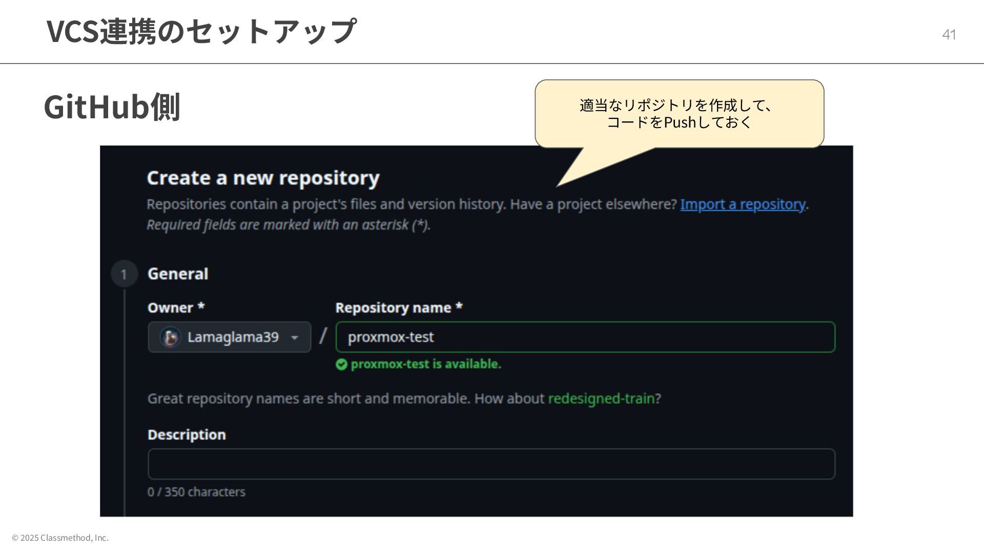 © 2025 Classmethod, Inc. VCS連携のセットアップ 41 GitHub側 適当なリポジトリを作成して、 コードをPushしておく