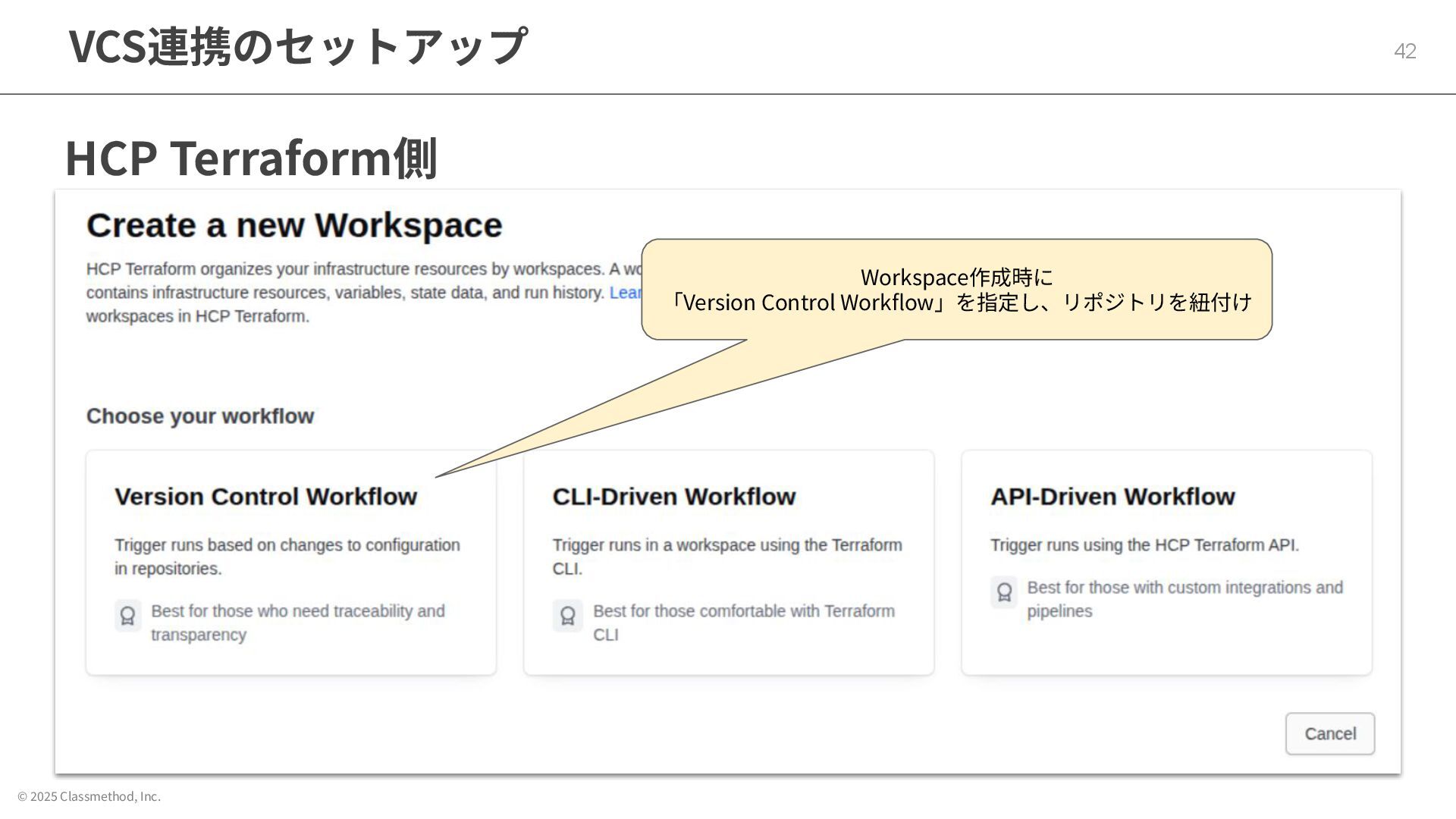 © 2025 Classmethod, Inc. VCS連携のセットアップ 42 HCP Terraform側 Workspace作成時に 「Version