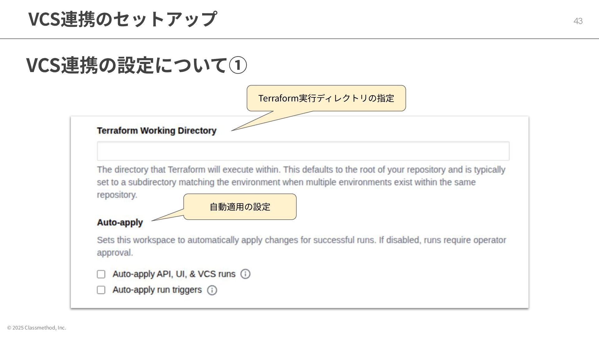 © 2025 Classmethod, Inc. VCS連携のセットアップ 43 VCS連携の設定について① Terraform実⾏ディレクトリの指定 ⾃動適⽤の設定