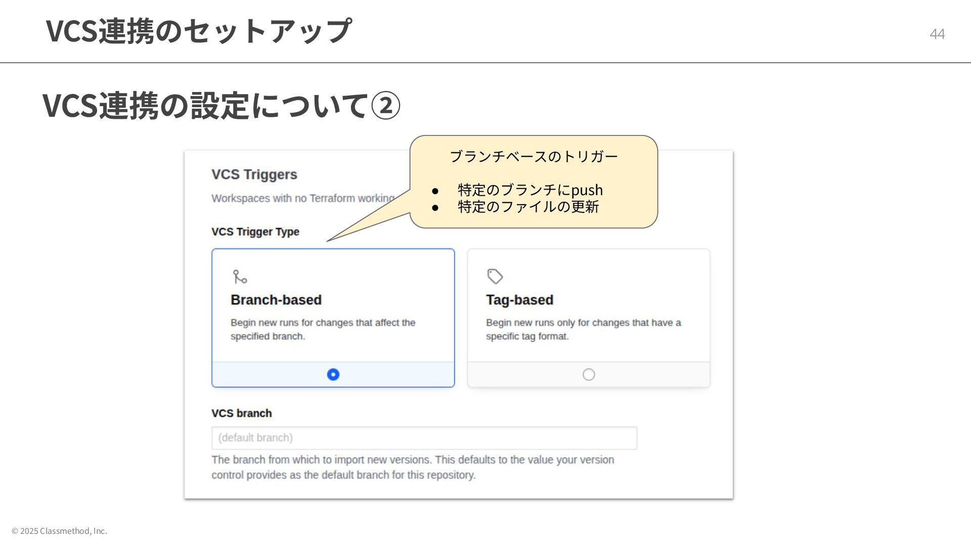 © 2025 Classmethod, Inc. VCS連携のセットアップ 44 VCS連携の設定について② ブランチベースのトリガー • 特定のブランチにpush