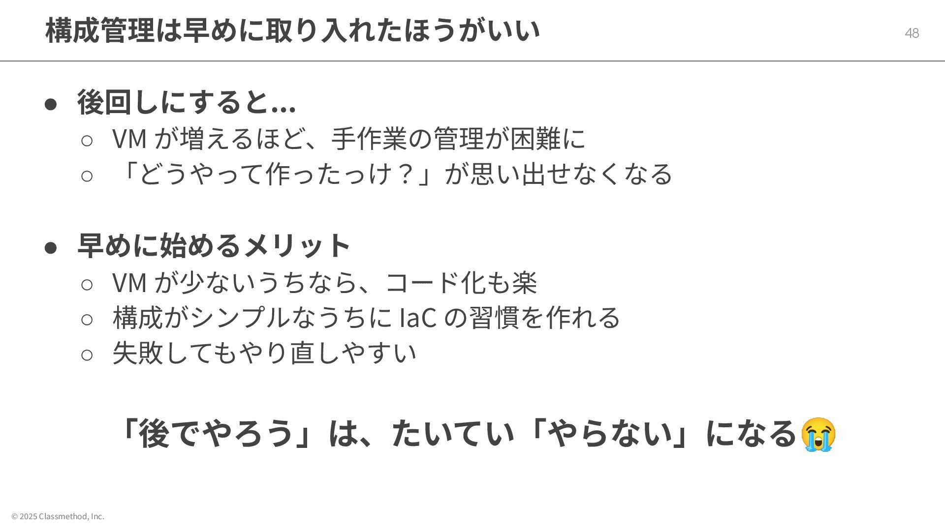 © 2025 Classmethod, Inc. 構成管理は早めに取り⼊れたほうがいい 48 • 後回しにすると... ◦ VM