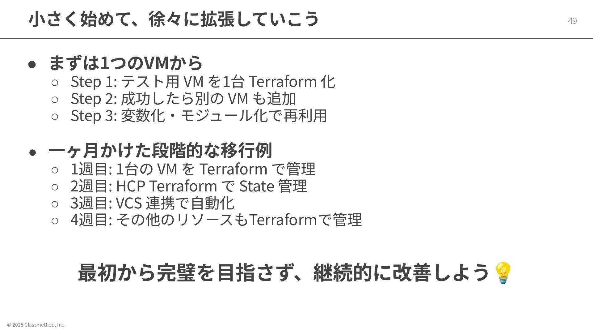 1: テスト⽤ VM を1台 Terraform 化 ◦ Step 2: 成功したら別の VM も追加 ◦ Step 3: 変数化‧モジュール化で再利⽤ • ⼀ヶ⽉かけた段階的な移⾏例 ◦ 1週⽬: 1台の VM を Terraform で管理 ◦ 2週⽬: HCP Terraform で State 管理 ◦ 3週⽬: VCS 連携で⾃動化 ◦ 4週⽬: その他のリソースもTerraformで管理 最初から完璧を⽬指さず、継続的に改善しよう💡