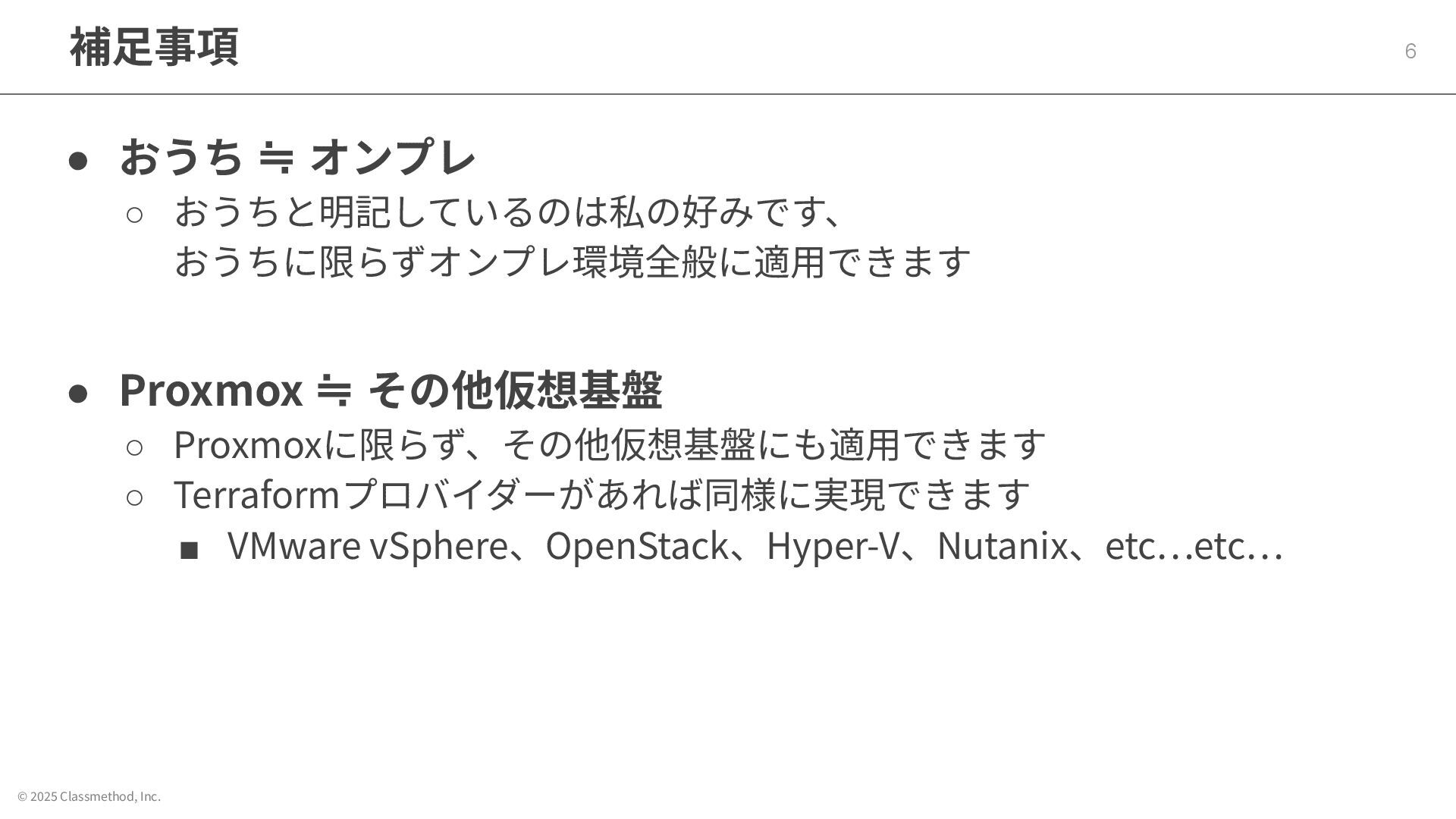 ◦ おうちと明記しているのは私の好みです、 おうちに限らずオンプレ環境全般に適⽤できます • Proxmox ≒ その他仮想基盤 ◦ Proxmoxに限らず、その他仮想基盤にも適⽤できます ◦ Terraformプロバイダーがあれば同様に実現できます ▪ VMware vSphere、OpenStack、Hyper-V、Nutanix、etc…etc…
