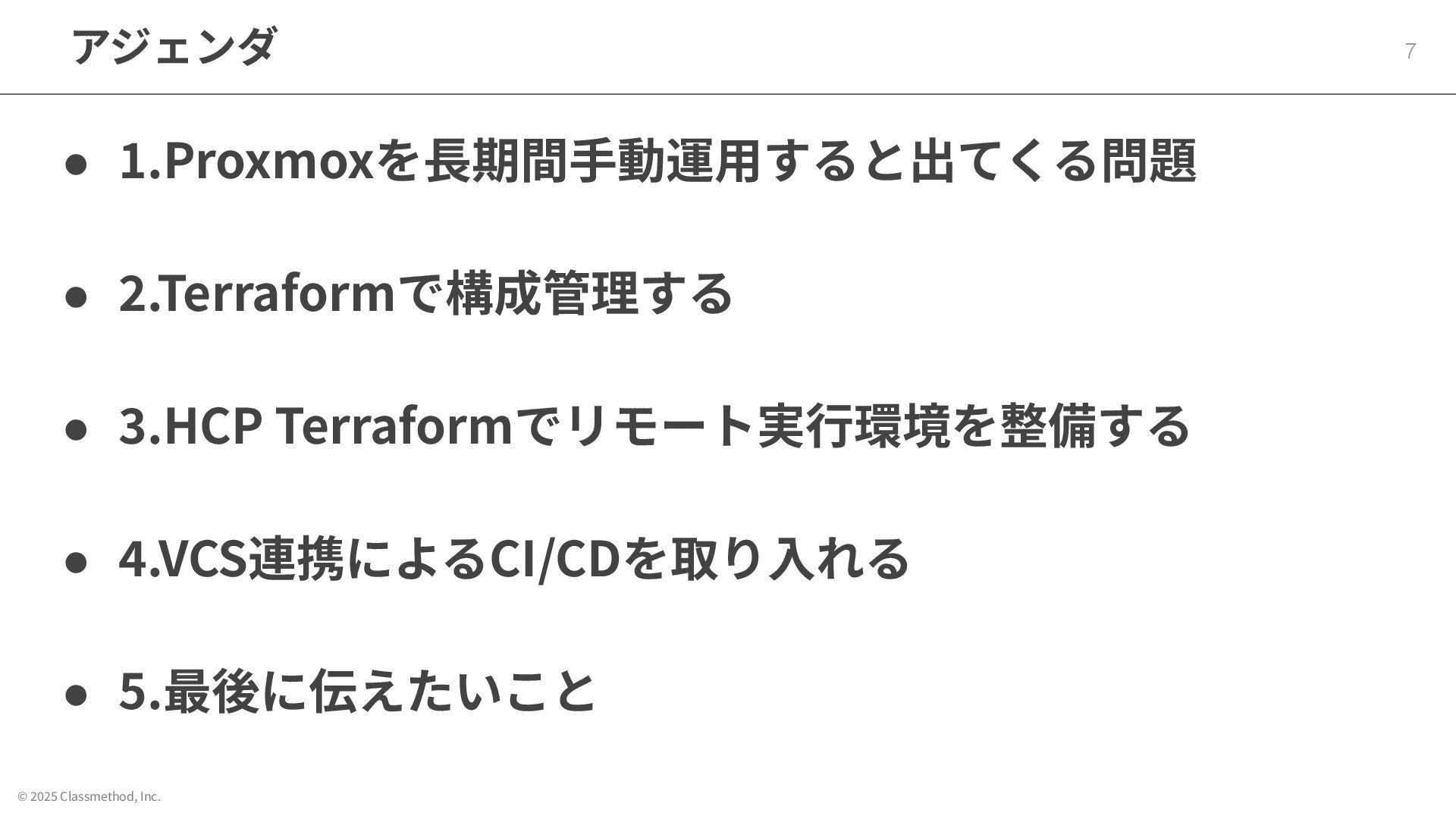 © 2025 Classmethod, Inc. アジェンダ 7 • 1.Proxmoxを⻑期間⼿動運⽤すると出てくる問題 • 2.Terraformで構成管理する