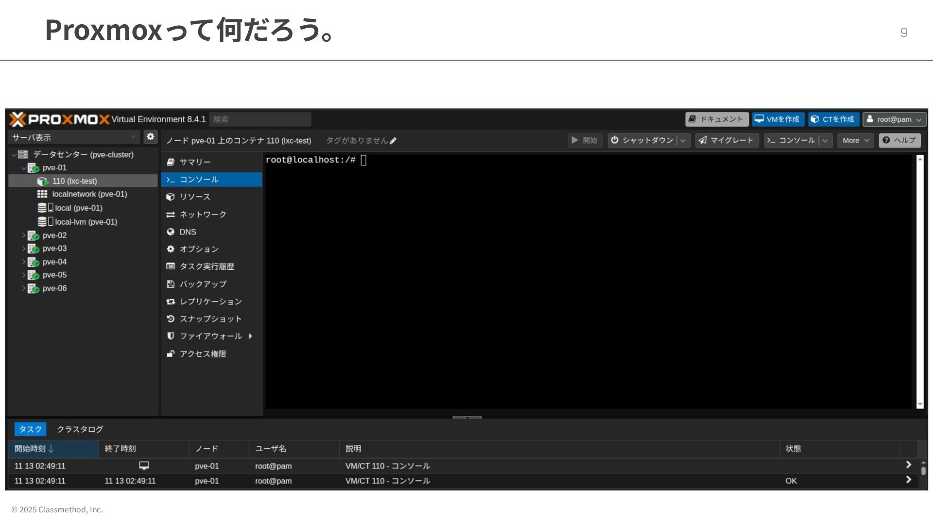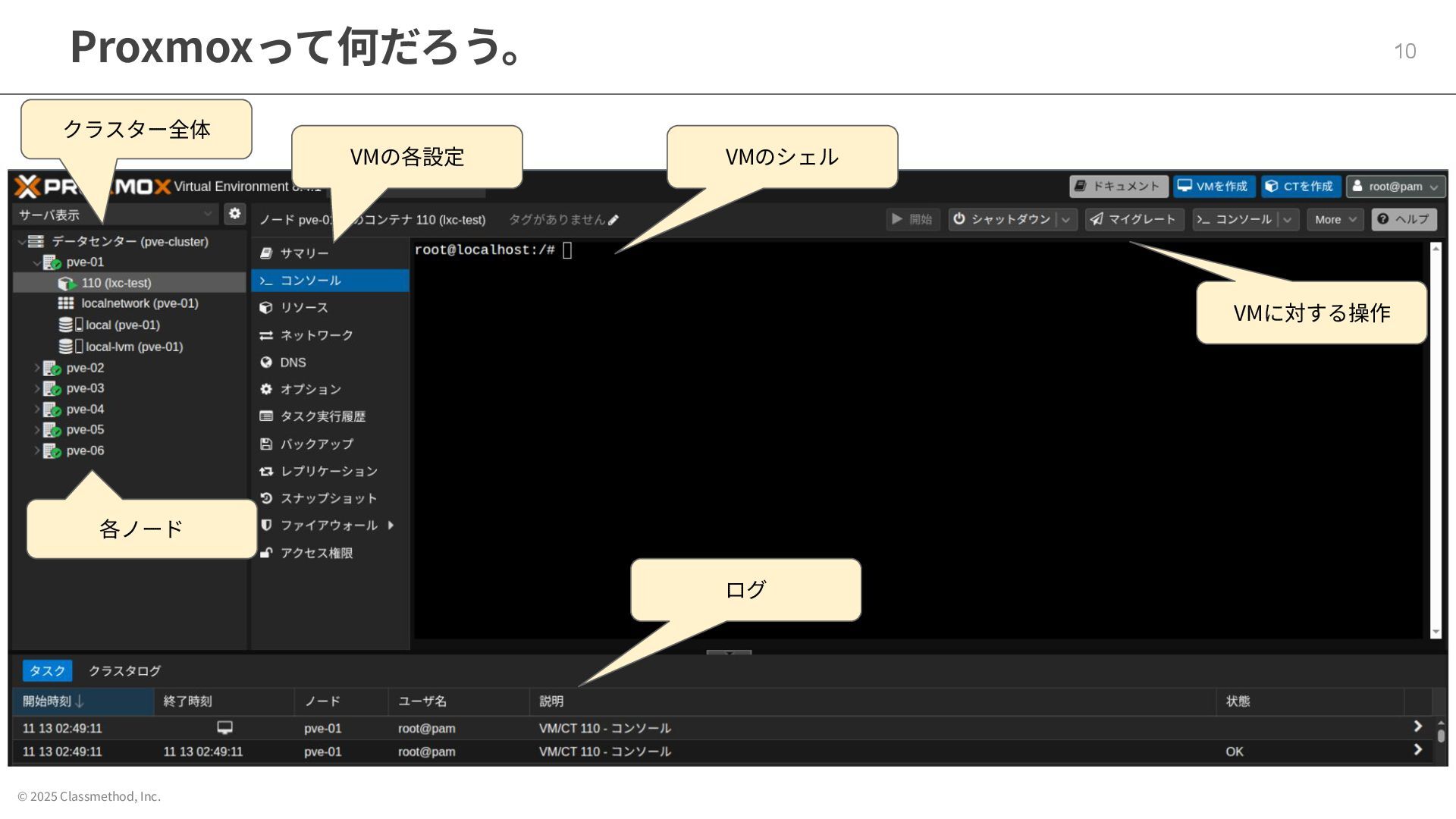 © 2025 Classmethod, Inc. Proxmoxって何だろう。 10 VMのシェル クラスター全体 各ノード ログ