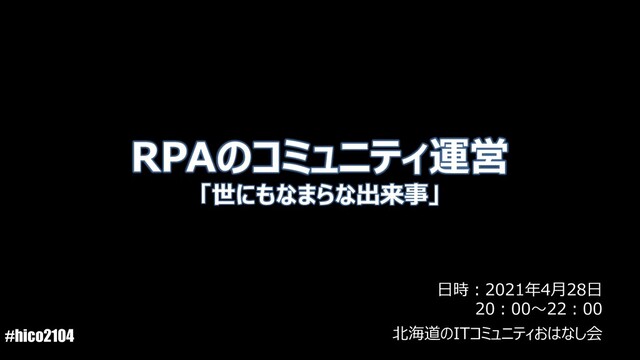 #hico2104 北海道のITコミュニティおはなし会 RPAのコミュニティ運営 「世にもなまらな出来事」 日時:2021年4月28日 20:00~22:00