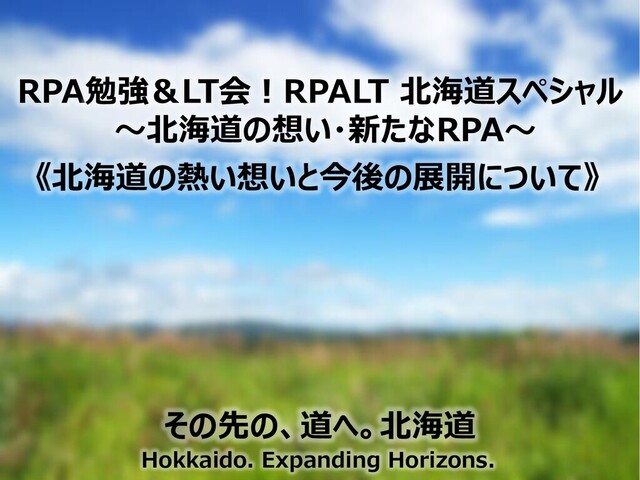 《北海道の熱い想いと今後の展開について》 RPA勉強&LT会!RPALT 北海道スペシャル ~北海道の想い・新たなRPA~ その先の、道へ。北海道 Hokkaido. Expanding Horizons.