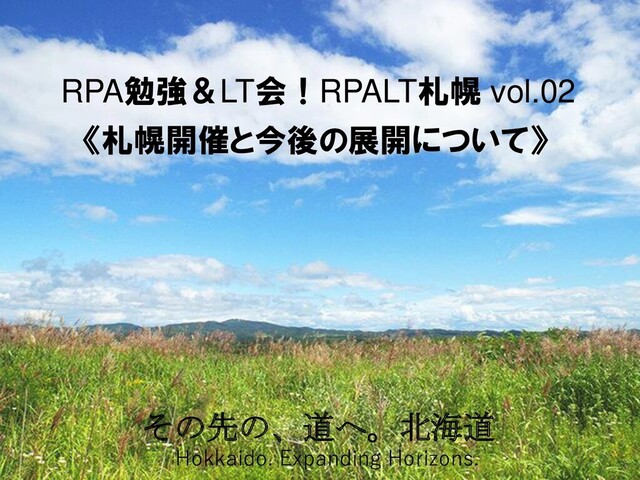 発表タイトル 19:00 開場(受付開始) 19:30 RPACommunity/チャラ電Mitz アンケート説明&コミュニティ趣旨説明 19:35 札幌支部現地リーダー・主催/Λ(らむだ) 札幌開催と今後の展開について 19:40 RPA初心者向けセミナー/Λ(らむだ) RPAでRPAを紹介します! 19:45 会場・懇親会スポンサーLT : デジック/岡本寛さん RPA初体験(UiPath) 19:55 RPAセミナー:WinActor/井上郡章さん WinActor紹介 休憩 メディアスポンサーLT:RPABANK RちゃんのRPAニュース LT1:渡部薫さん WinActor初級研修Ver.4.0アップデート速報 LT2:天羽高士さん 意外と出来ちゃうRPA AI-OCRセミナー:AI inside/梅田祥太朗さん 開発メーカーが語る、今後のAI-OCRの方向性 20:45 クロージング:全員 総括 20:50 集合記念写真 20:55 懇親会(任意) 22:00 完全撤収