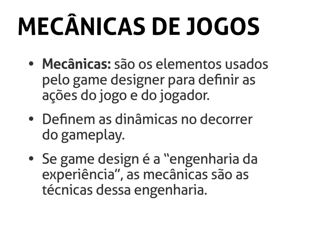 game designer para definir as ações do jogo e do jogador. • Definem as dinâmicas no decorrer do gameplay. • Se game design é a “engenharia da experiência”, as mecânicas são as técnicas dessa engenharia.