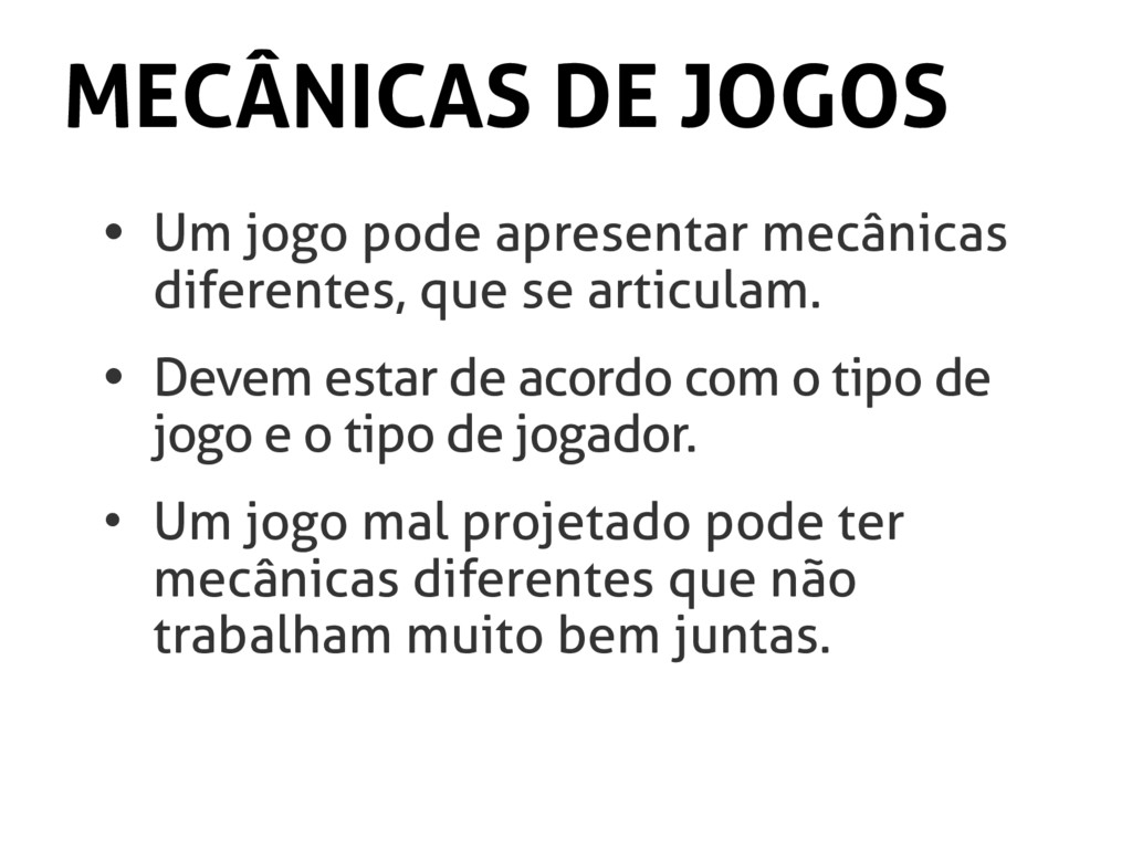 que se articulam. • Devem estar de acordo com o tipo de jogo e o tipo de jogador. • Um jogo mal projetado pode ter mecânicas diferentes que não trabalham muito bem juntas.