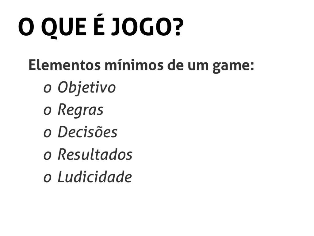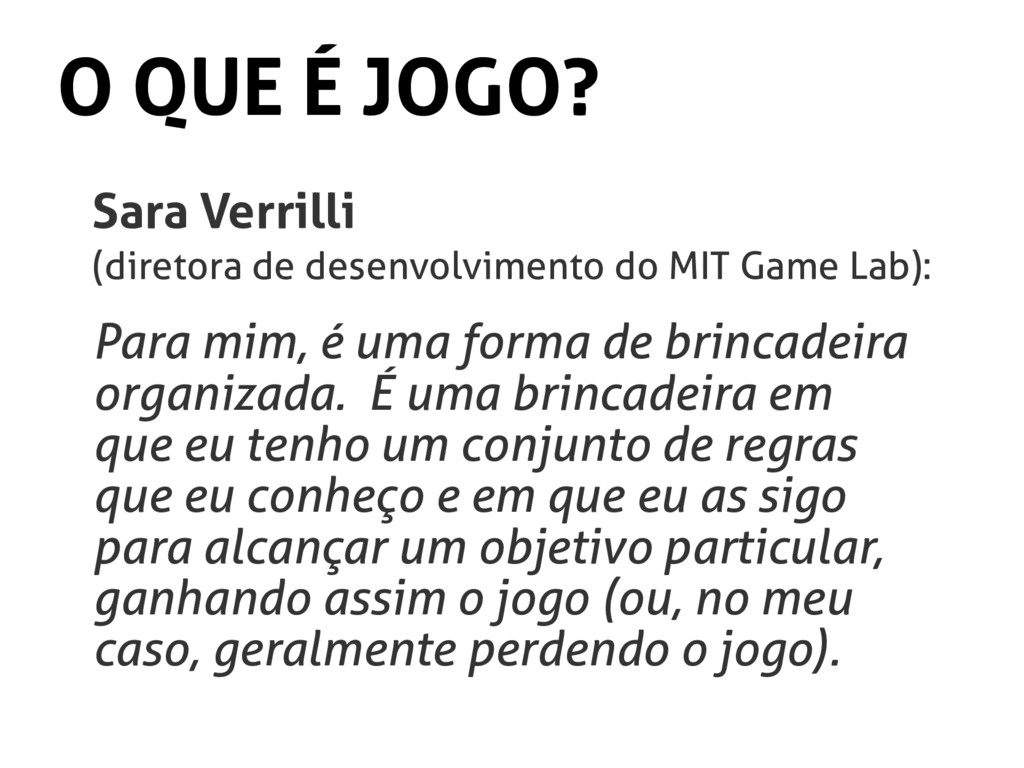 MIT Game Lab): Para mim, é uma forma de brincadeira organizada. É uma brincadeira em que eu tenho um conjunto de regras que eu conheço e em que eu as sigo para alcançar um objetivo particular, ganhando assim o jogo (ou, no meu caso, geralmente perdendo o jogo).