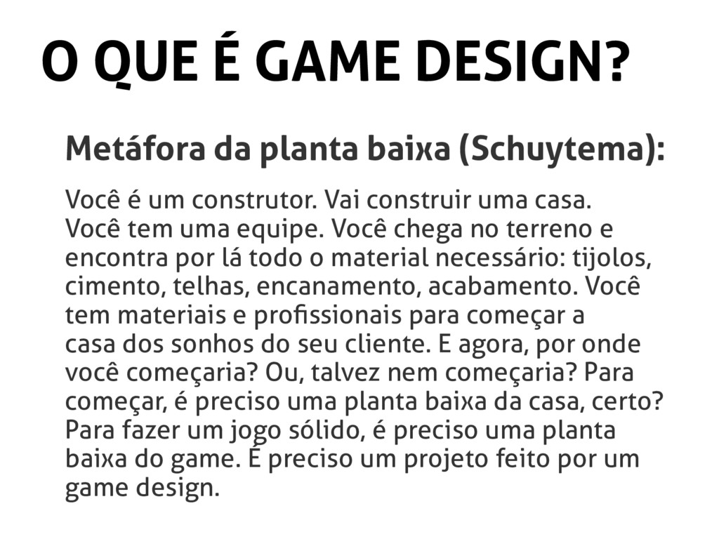 Você é um construtor. Vai construir uma casa. Você tem uma equipe. Você chega no terreno e encontra por lá todo o material necessário: tijolos, cimento, telhas, encanamento, acabamento. Você tem materiais e profissionais para começar a casa dos sonhos do seu cliente. E agora, por onde você começaria? Ou, talvez nem começaria? Para começar, é preciso uma planta baixa da casa, certo? Para fazer um jogo sólido, é preciso uma planta baixa do game. É preciso um projeto feito por um game design.