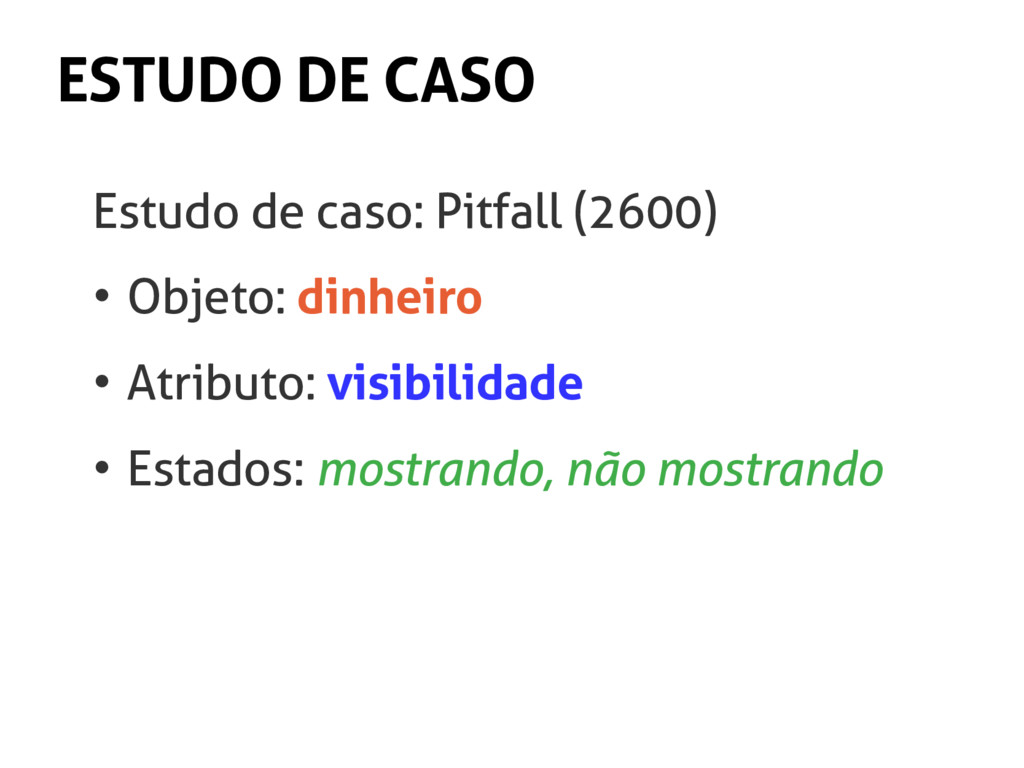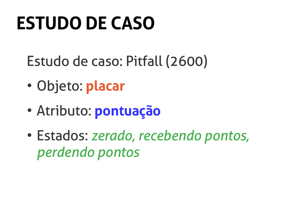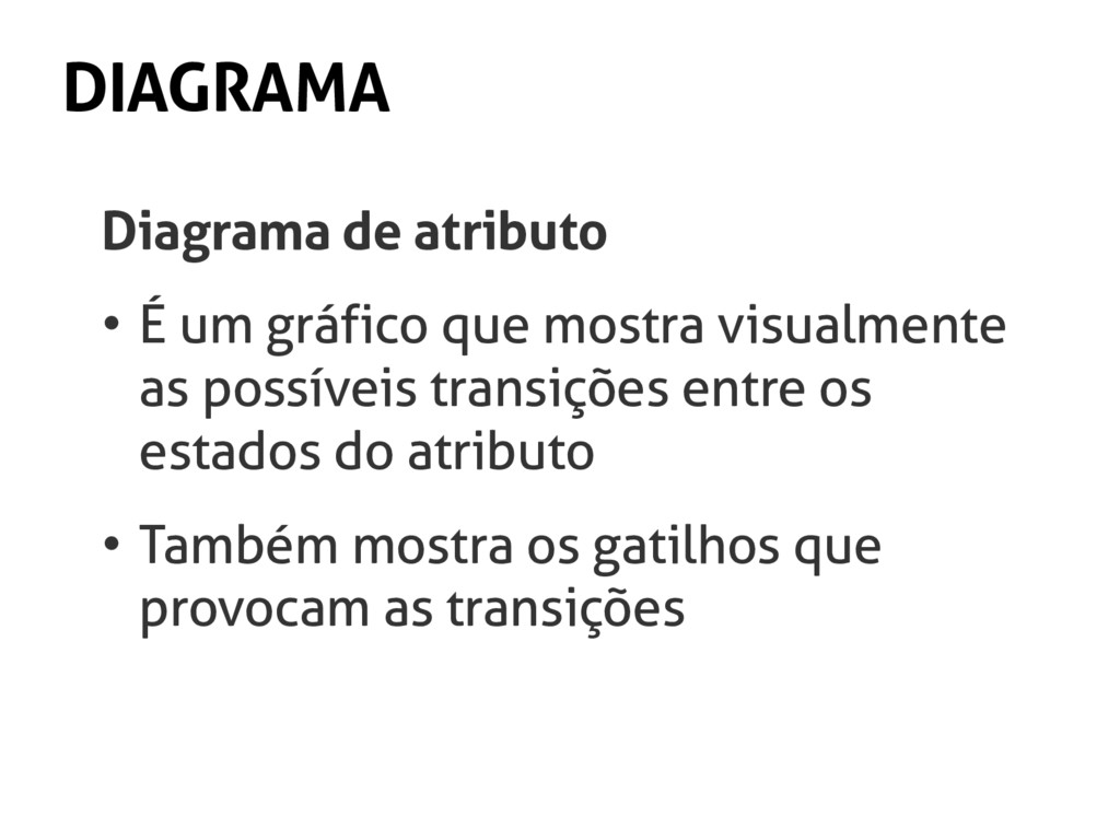 precisos os gatilhos (triggers). • Então, na frase anterior, qual gatilho mudaria o atributo “aparência” para o estado “feio”? • R.: cair no chão, sofrer impacto, sofrer vandalismo, desgastar...