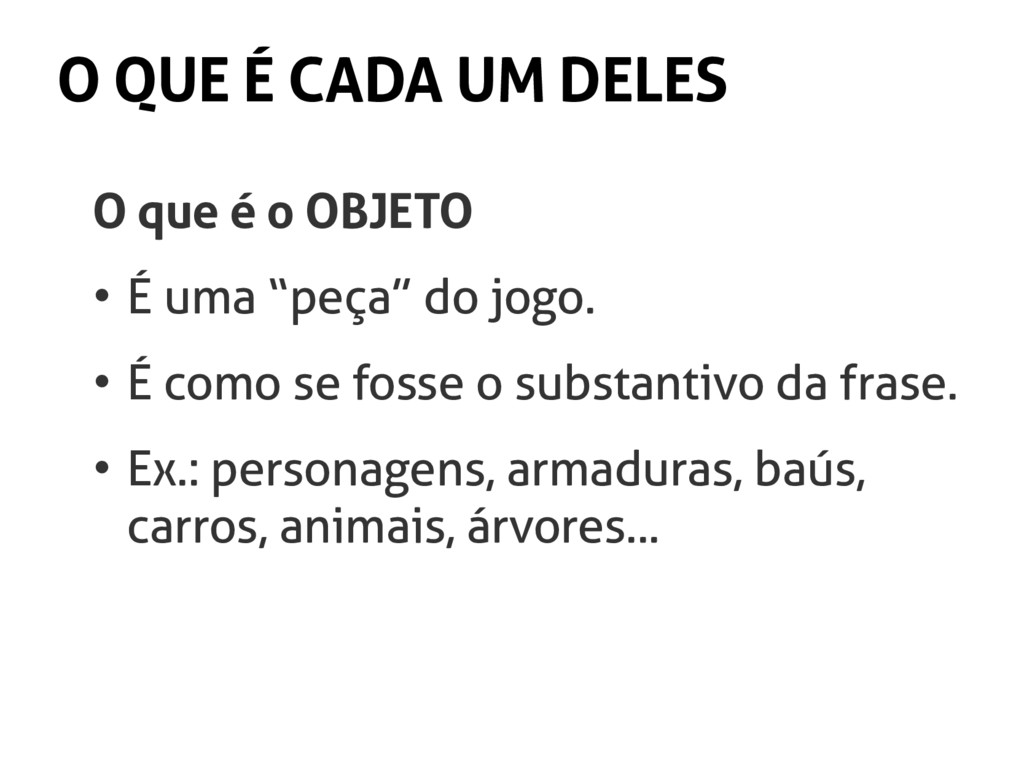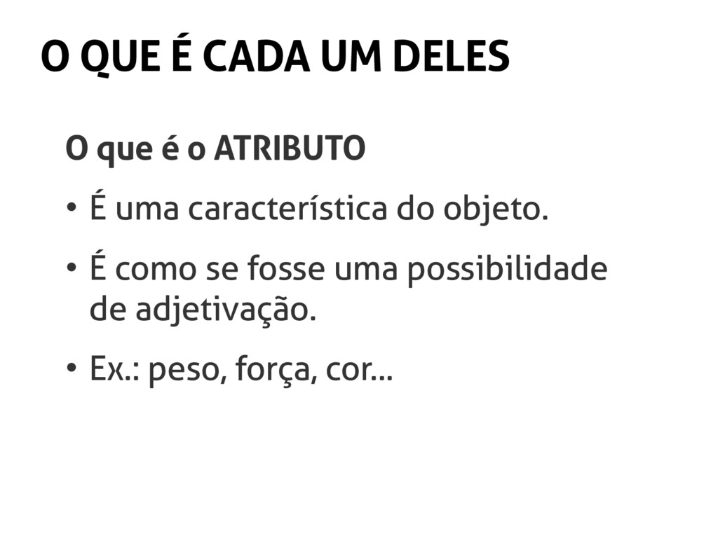 ESTADO • É o atual valor do atributo. • É o adjetivo neste momento. • Ou seja, a característica do objeto em determinado momento. • Ex.: pesado ou leve, forte ou fraco...