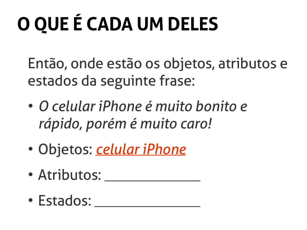objetos, atributos e estados da seguinte frase: • O celular iPhone é muito bonito e rápido, porém é muito caro! • Objetos: celular iPhone • Atributos: • Estados: