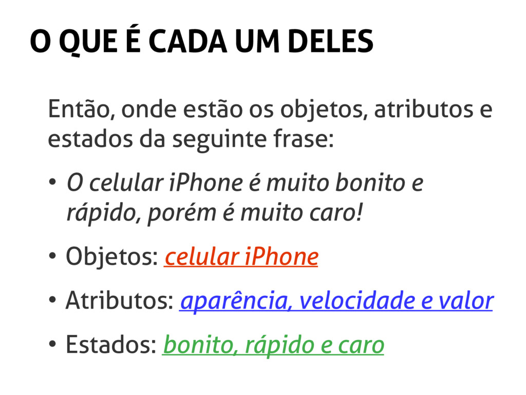 objetos, atributos e estados da seguinte frase: • O celular iPhone é muito bonito e rápido, porém é muito caro! • Objetos: celular iPhone • Atributos: aparência, velocidade e valor • Estados: bonito, rápido e caro