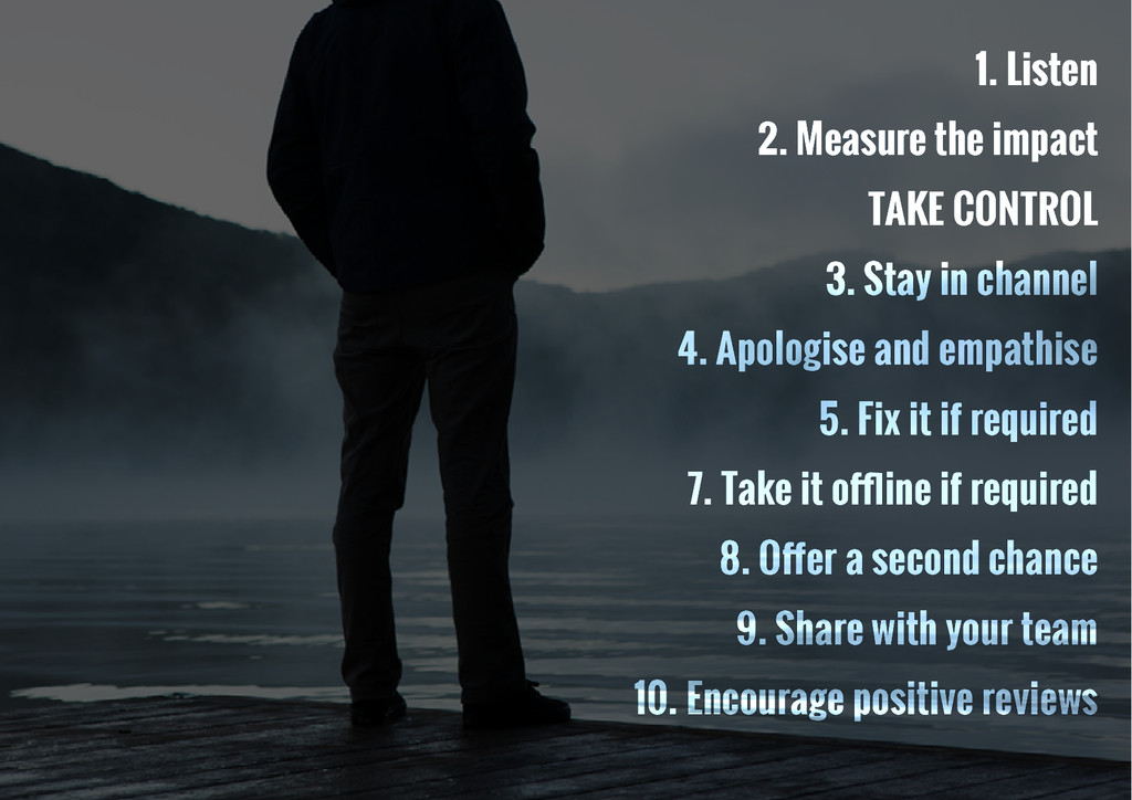 in channel 4. Apologise and empathise 5. Fix it if required 7. Take it offline if required 8. Offer a second chance 9. Share with your team 10. Encourage positive reviews 1. Listen 2. Measure the impact TAKE CONTROL 3. Stay in channel 4. Apologise and empathise 5. Fix it if required 7. Take it offline if required 8. Offer a second chance 9. Share with your team 10. Encourage positive reviews