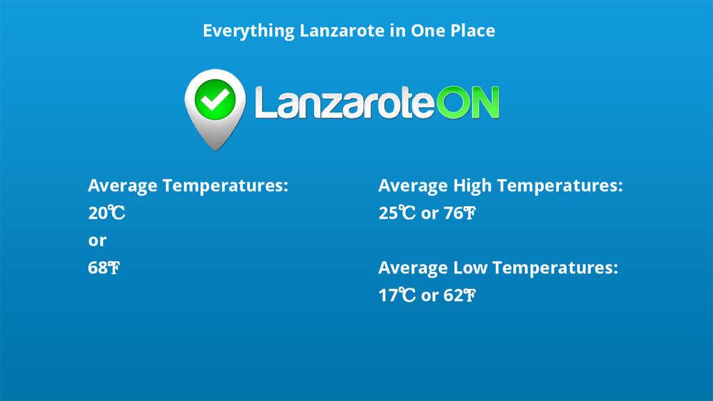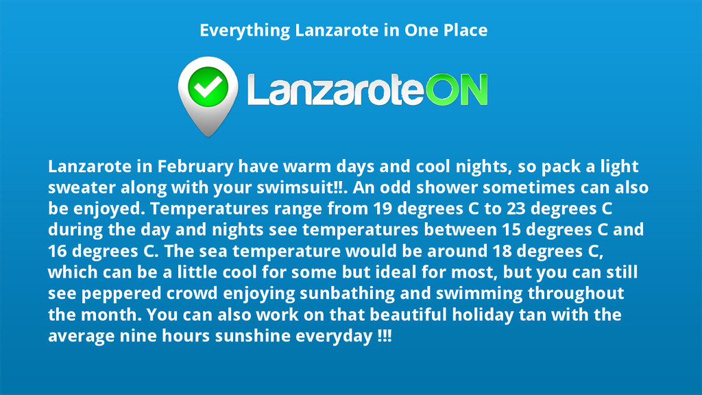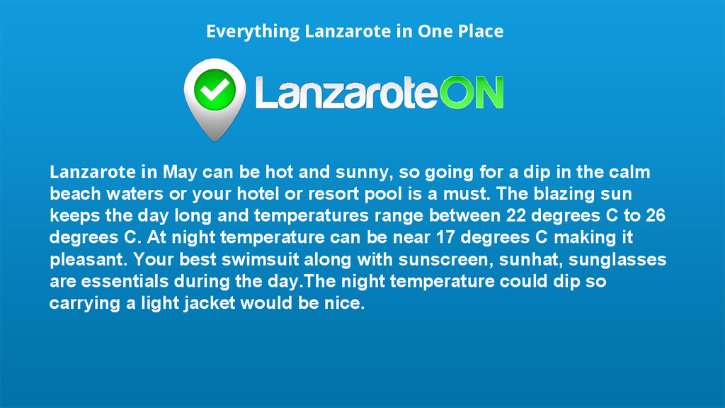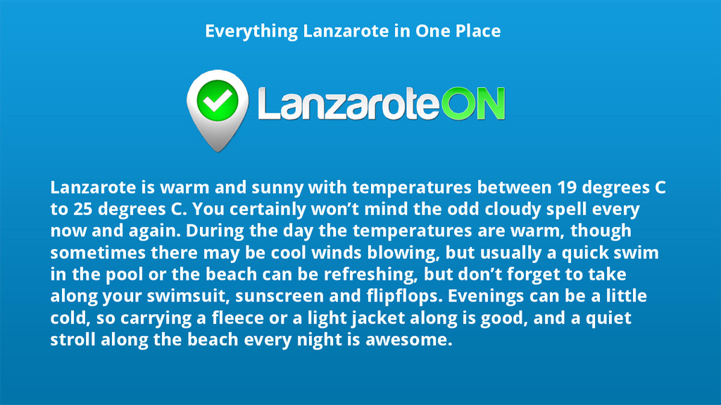 C to 25 degrees C. You certainly won’t mind the odd cloudy spell every now and again. During the day the temperatures are warm, though sometimes there may be cool winds blowing, but usually a quick swim in the pool or the beach can be refreshing, but don’t forget to take along your swimsuit, sunscreen and flipflops. Evenings can be a little cold, so carrying a fleece or a light jacket along is good, and a quiet stroll along the beach every night is awesome. Everything Lanzarote in One Place