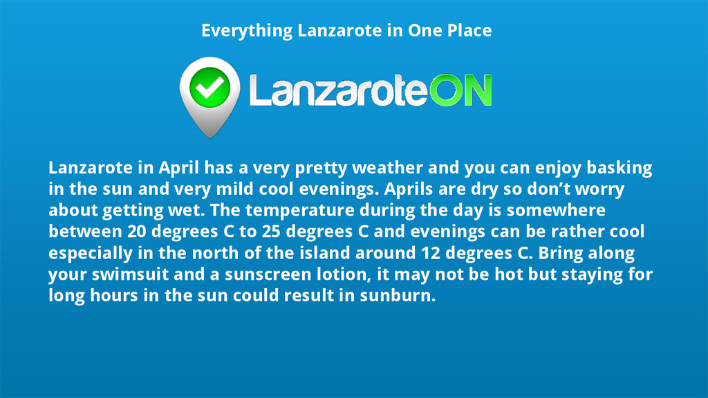 can enjoy basking in the sun and very mild cool evenings. Aprils are dry so don’t worry about getting wet. The temperature during the day is somewhere between 20 degrees C to 25 degrees C and evenings can be rather cool especially in the north of the island around 12 degrees C. Bring along your swimsuit and a sunscreen lotion, it may not be hot but staying for long hours in the sun could result in sunburn. Everything Lanzarote in One Place
