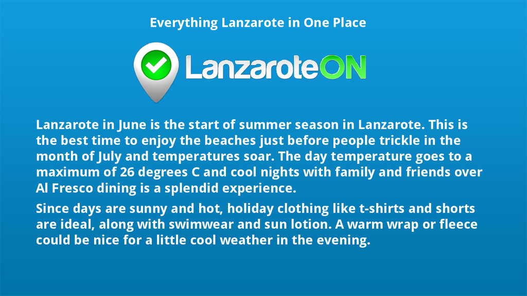 Lanzarote. This is the best time to enjoy the beaches just before people trickle in the month of July and temperatures soar. The day temperature goes to a maximum of 26 degrees C and cool nights with family and friends over Al Fresco dining is a splendid experience. Since days are sunny and hot, holiday clothing like t-shirts and shorts are ideal, along with swimwear and sun lotion. A warm wrap or fleece could be nice for a little cool weather in the evening. Everything Lanzarote in One Place