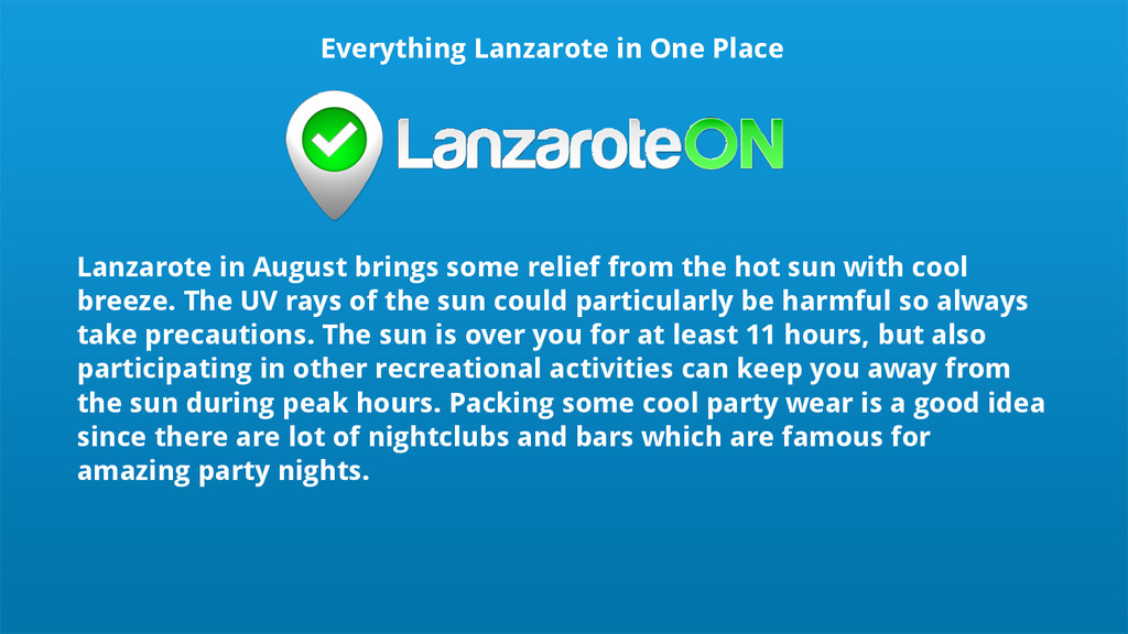 with cool breeze. The UV rays of the sun could particularly be harmful so always take precautions. The sun is over you for at least 11 hours, but also participating in other recreational activities can keep you away from the sun during peak hours. Packing some cool party wear is a good idea since there are lot of nightclubs and bars which are famous for amazing party nights. Everything Lanzarote in One Place