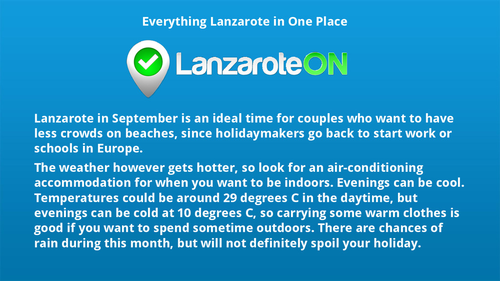 want to have less crowds on beaches, since holidaymakers go back to start work or schools in Europe. The weather however gets hotter, so look for an air-conditioning accommodation for when you want to be indoors. Evenings can be cool. Temperatures could be around 29 degrees C in the daytime, but evenings can be cold at 10 degrees C, so carrying some warm clothes is good if you want to spend sometime outdoors. There are chances of rain during this month, but will not definitely spoil your holiday. Everything Lanzarote in One Place