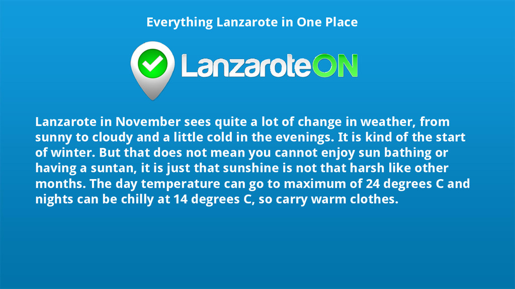 weather, from sunny to cloudy and a little cold in the evenings. It is kind of the start of winter. But that does not mean you cannot enjoy sun bathing or having a suntan, it is just that sunshine is not that harsh like other months. The day temperature can go to maximum of 24 degrees C and nights can be chilly at 14 degrees C, so carry warm clothes. Everything Lanzarote in One Place