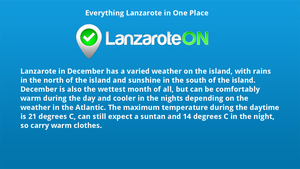 with rains in the north of the island and sunshine in the south of the island. December is also the wettest month of all, but can be comfortably warm during the day and cooler in the nights depending on the weather in the Atlantic. The maximum temperature during the daytime is 21 degrees C, can still expect a suntan and 14 degrees C in the night, so carry warm clothes. Everything Lanzarote in One Place