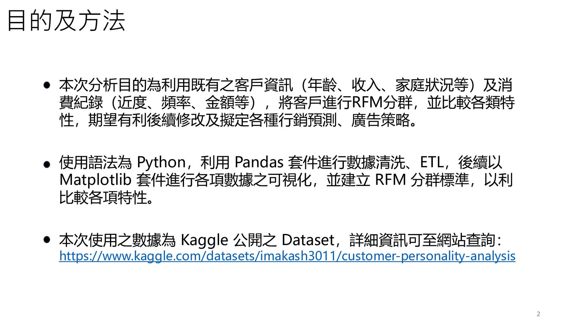 2 目的及方法 本次分析目的為利用既有之客戶資訊(年齡、收入、家庭狀況等)及消 費紀錄(近度、頻率、金額等),將客戶進行RFM分群,並比較各類特 性,期望有利後續修改及擬定各種行銷預測、廣告策略。 使用語法為 Python,利用 Pandas 套件進行數據清洗、ETL,後續以 Matplotlib