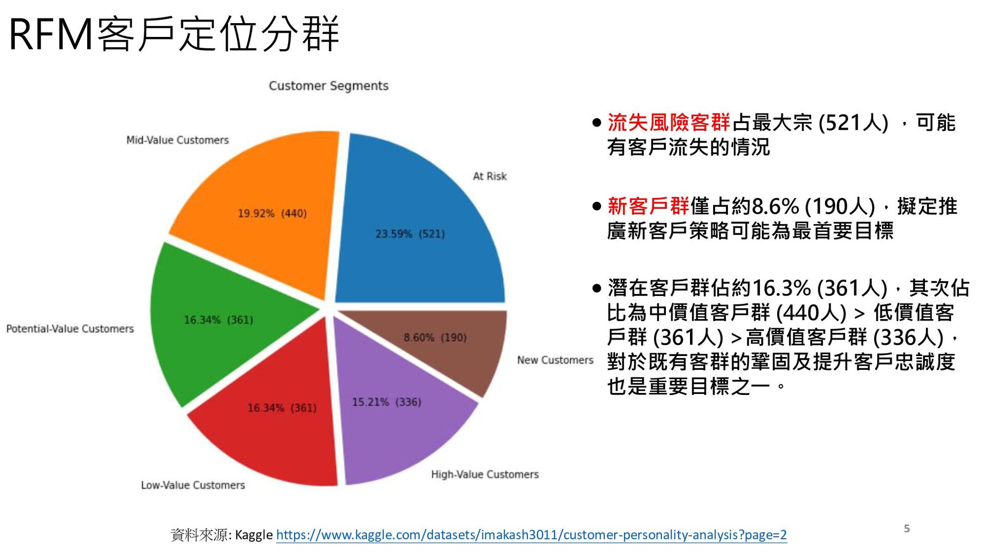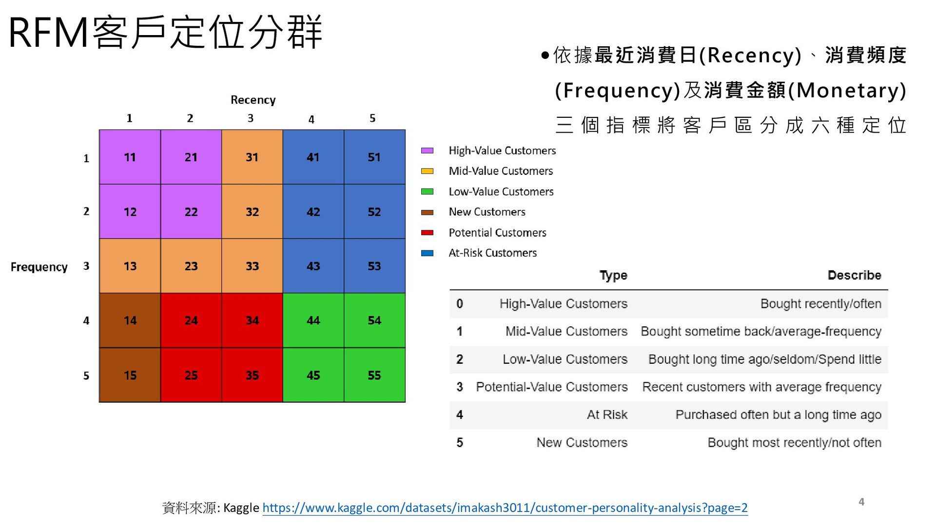 資料來源: Kaggle https://www.kaggle.com/datasets/imakash3011/customer-personality-analysis?page=2 RFM客戶定位分群 依據最近消費日(Recency)、消費頻度 (Frequency)及消費金額(Monetary) 三 個 指 標