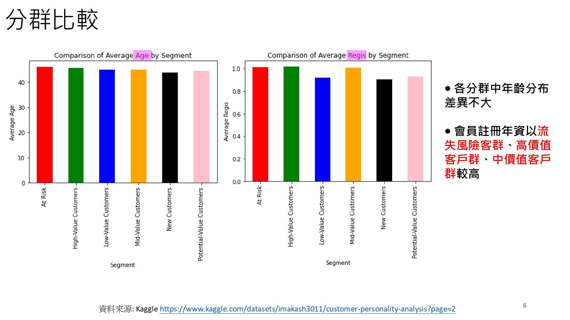 潛在客戶群佔約16.3% (361人),其次佔 比為中價值客戶群 (440人) > 低價值客 戶群 (361人) >高價值客戶群 (336人), 對於既有客群的鞏固及提升客戶忠誠度 也是重要目標之一。 5 資料來源: Kaggle https://www.kaggle.com/datasets/imakash3011/customer-personality-analysis?page=2