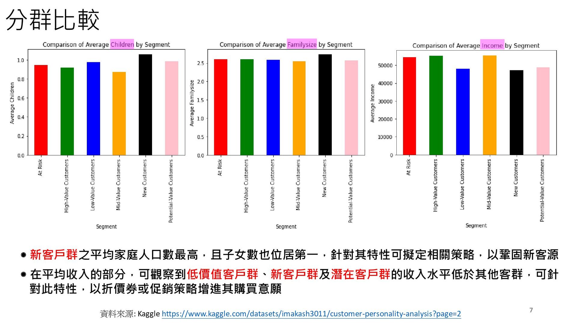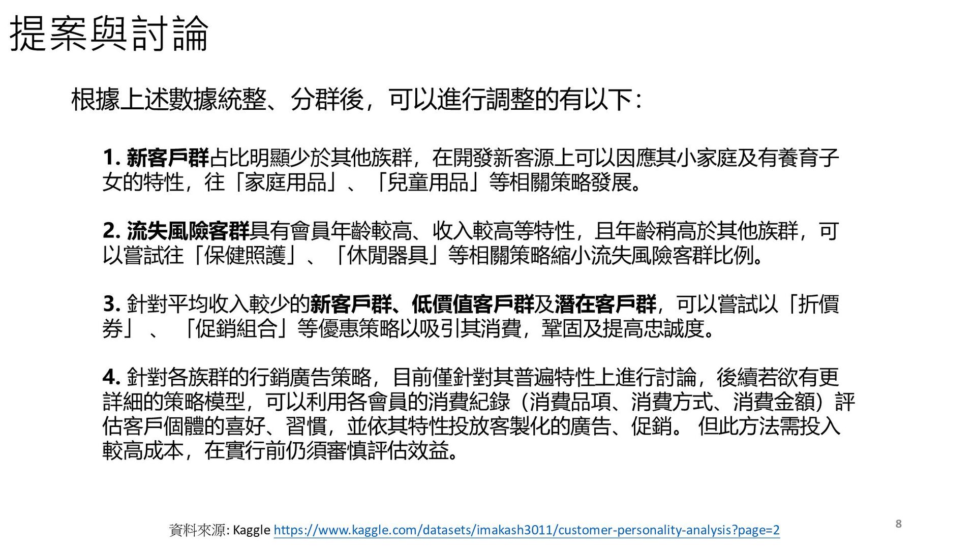 分群比較 新客戶群之平均家庭人口數最高,且子女數也位居第一,針對其特性可擬定相關策略,以鞏固新客源 在平均收入的部分,可觀察到低價值客戶群、新客戶群及潛在客戶群的收入水平低於其他客群,可針 對此特性,以折價券或促銷策略增進其購買意願 7 資料來源: Kaggle https://www.kaggle.com/datasets/imakash3011/customer-personality-analysis?page=2