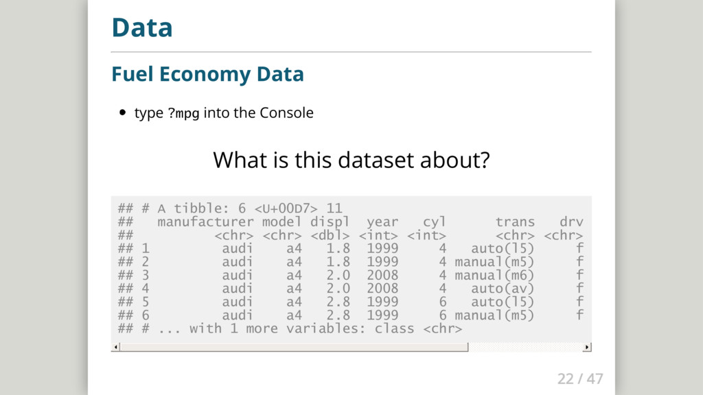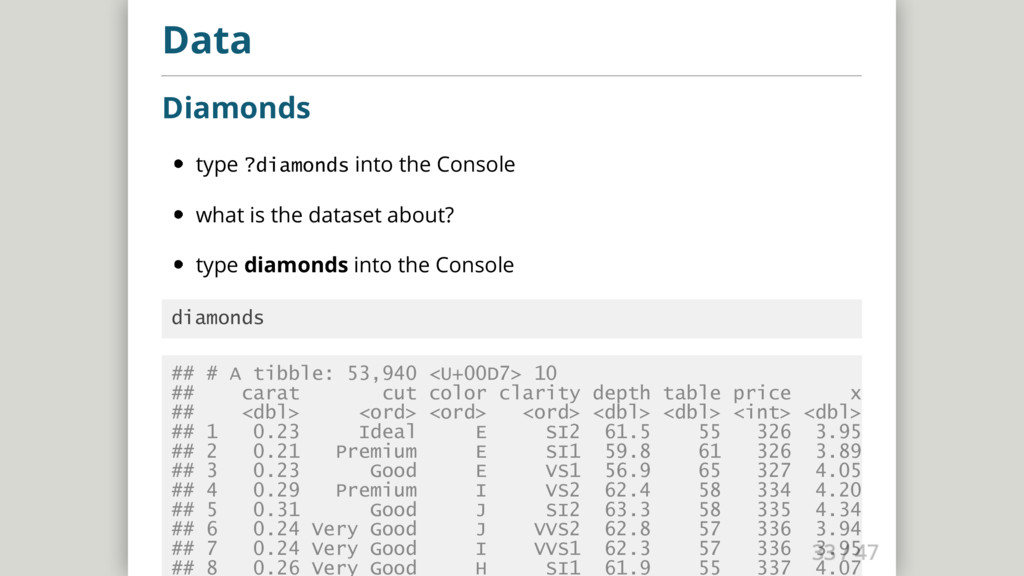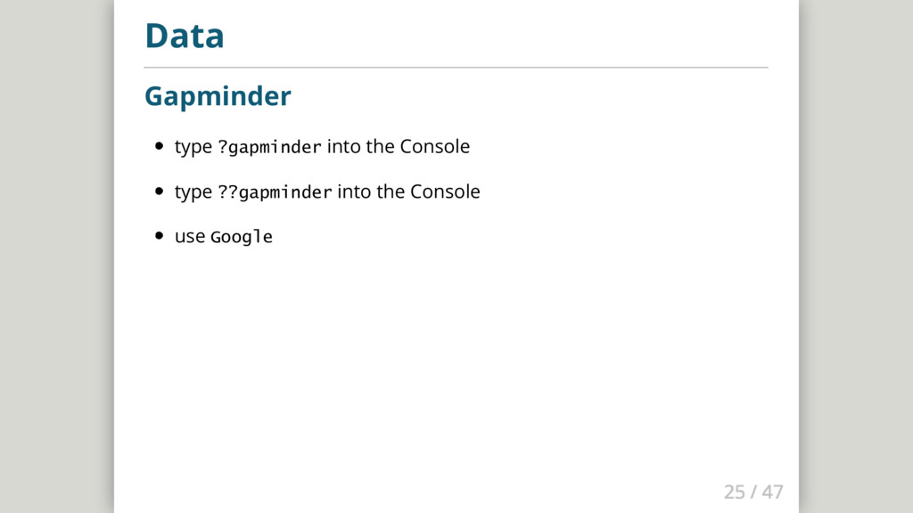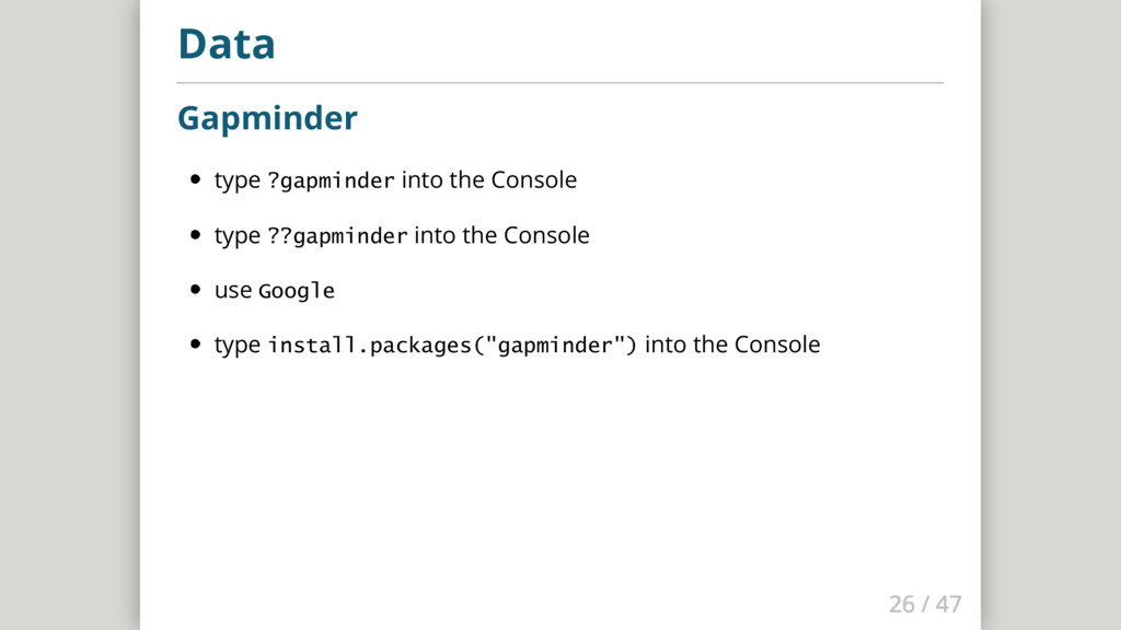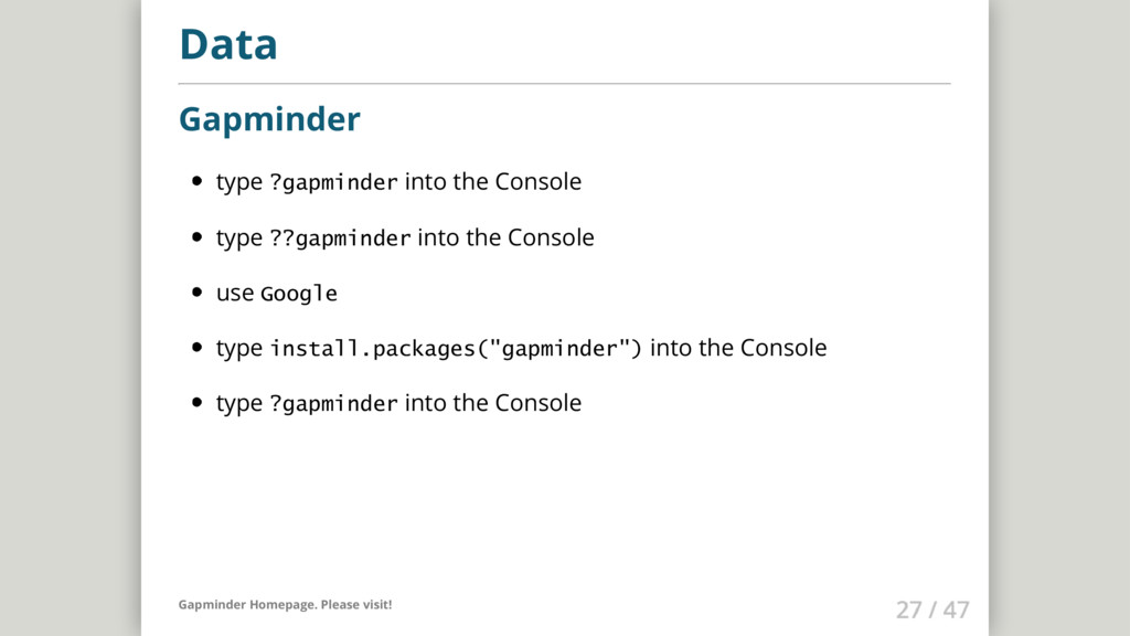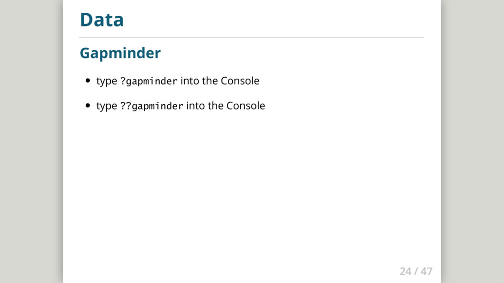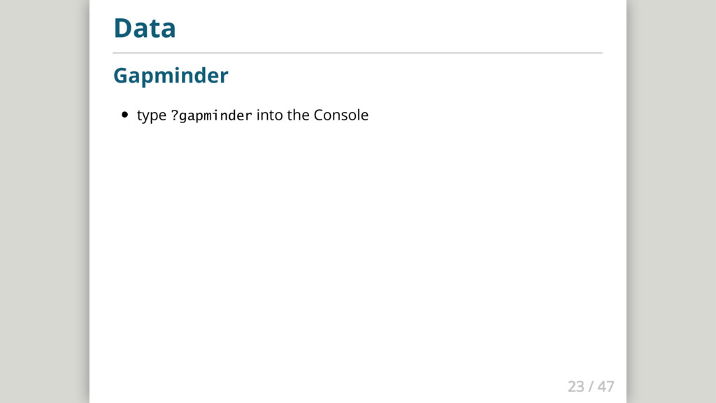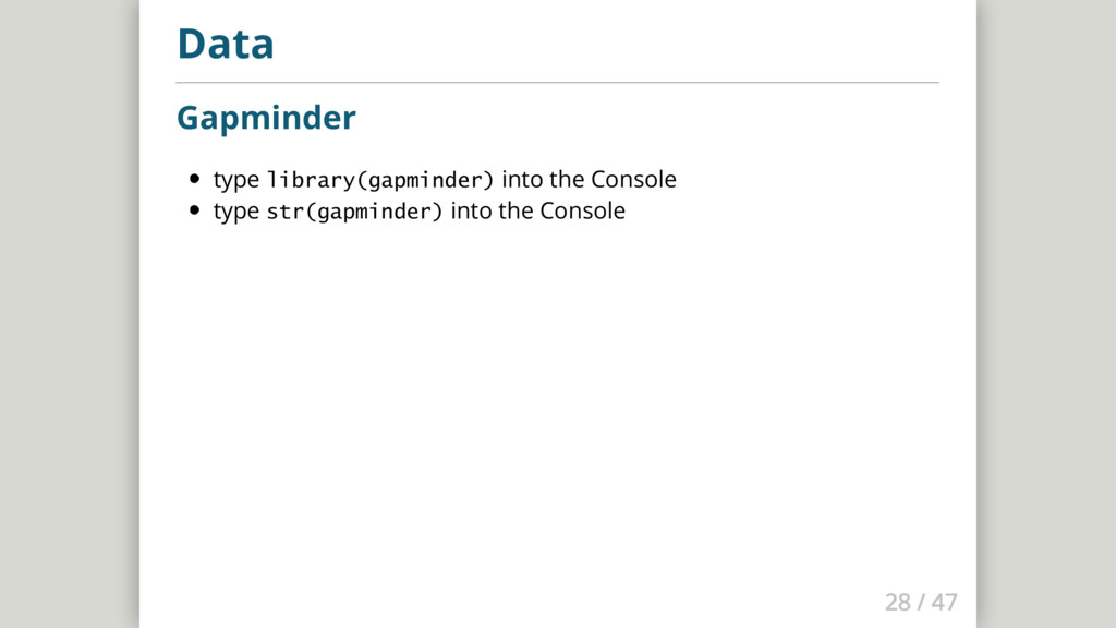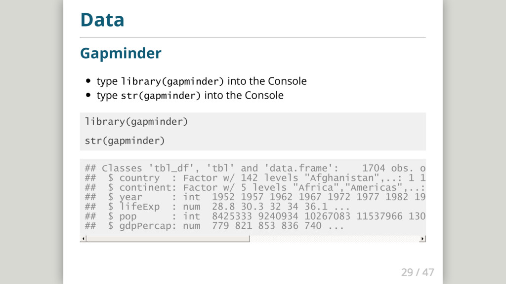 the Console library(gapminder) str(gapminder) ## Classes 'tbl_df', 'tbl' and 'data.frame': 1704 obs. of 6 variables ## $ country : Factor w/ 142 levels "Afghanistan",..: 1 1 1 1 1 1 1 1 1 ## $ continent: Factor w/ 5 levels "Africa","Americas",..: 3 3 3 3 3 3 3 ## $ year : int 1952 1957 1962 1967 1972 1977 1982 1987 1992 1997 . ## $ lifeExp : num 28.8 30.3 32 34 36.1 ... ## $ pop : int 8425333 9240934 10267083 11537966 13079460 14880372 ## $ gdpPercap: num 779 821 853 836 740 ...