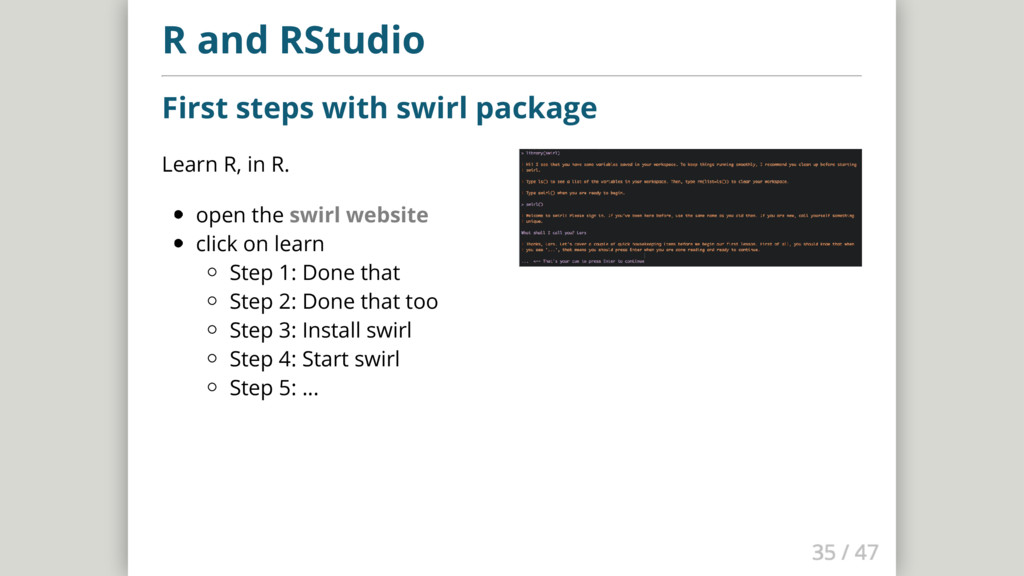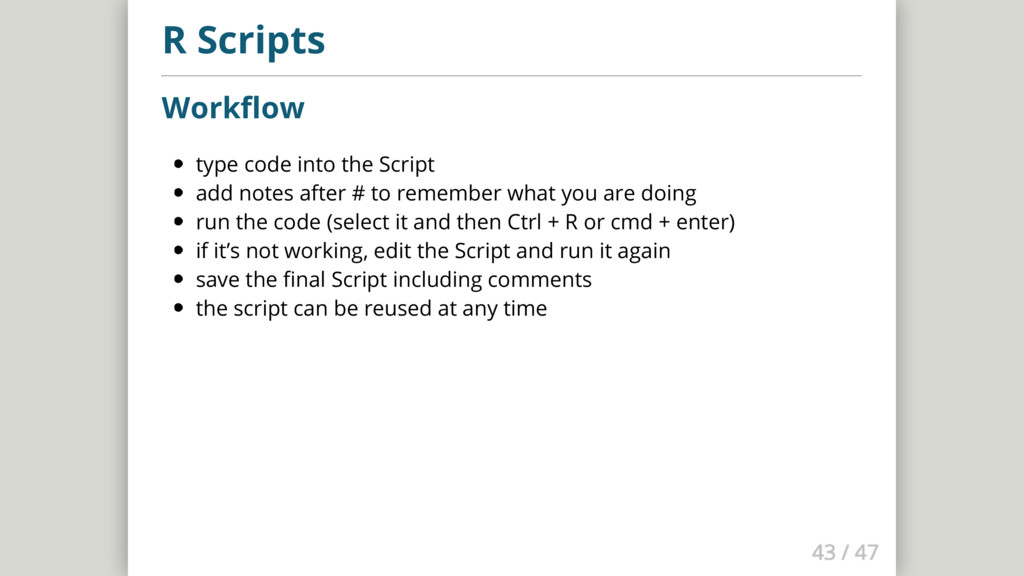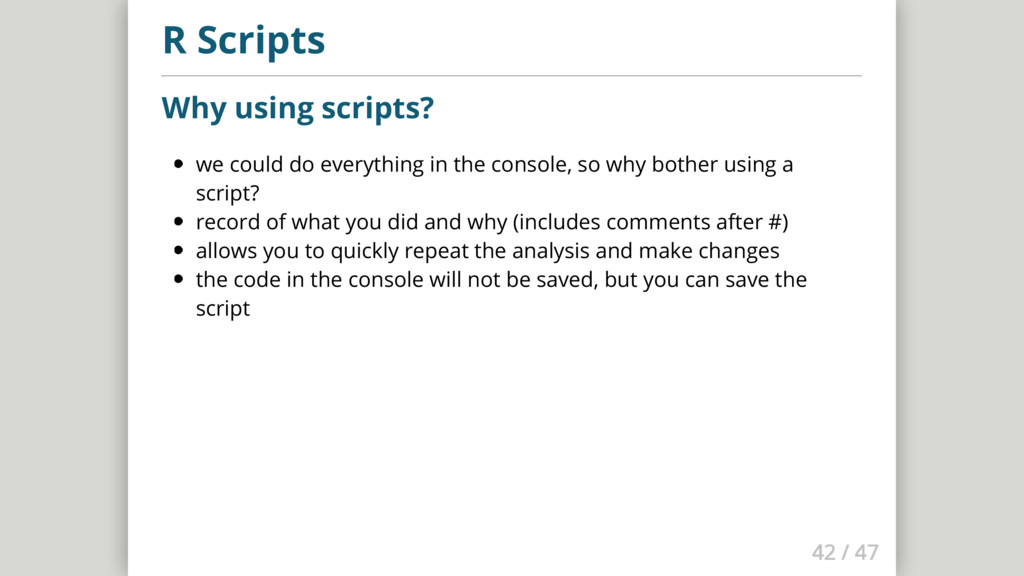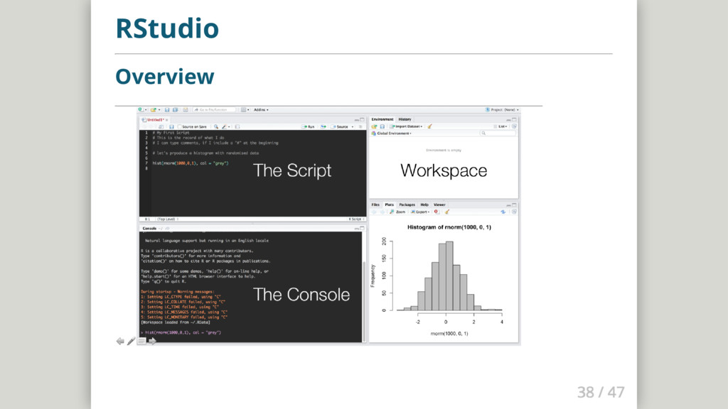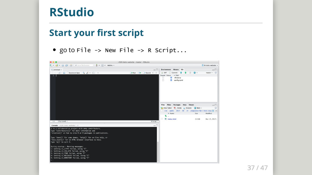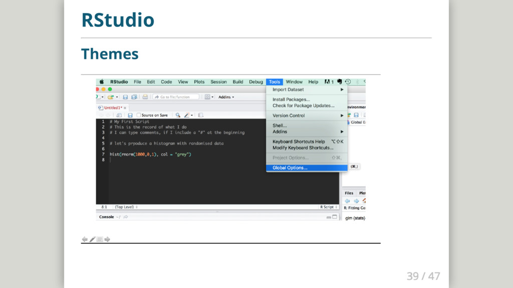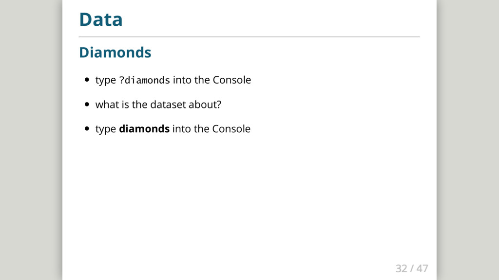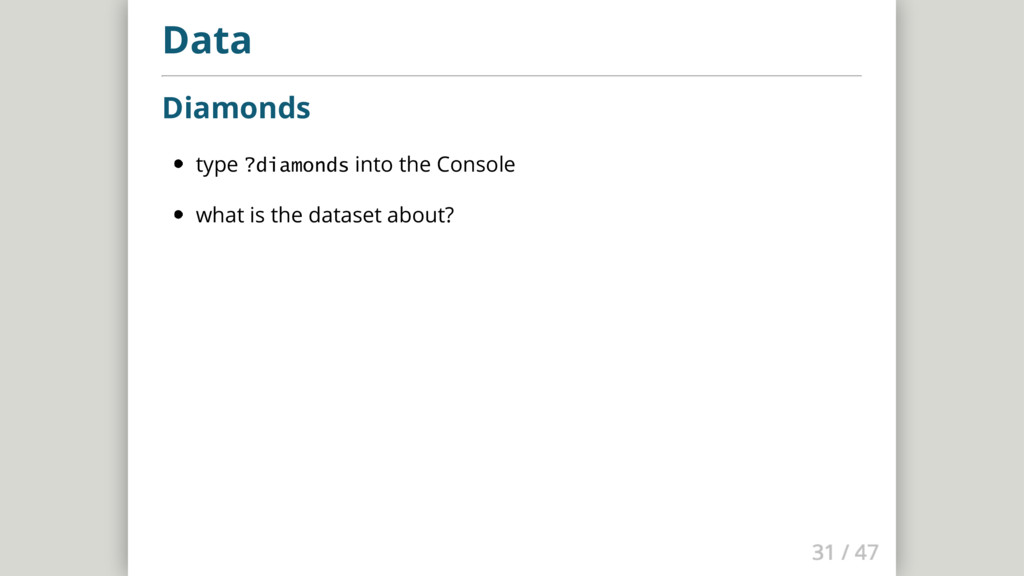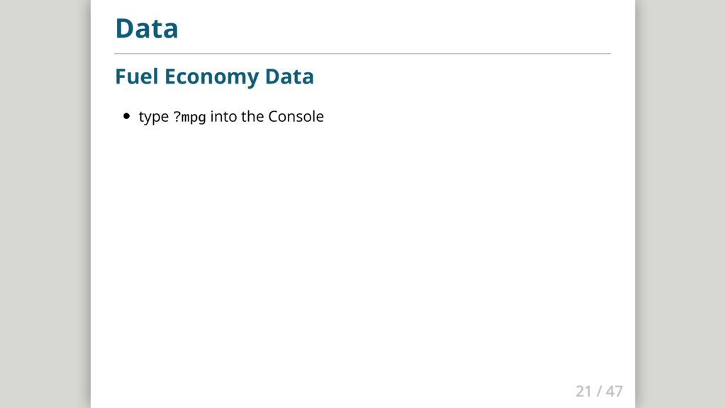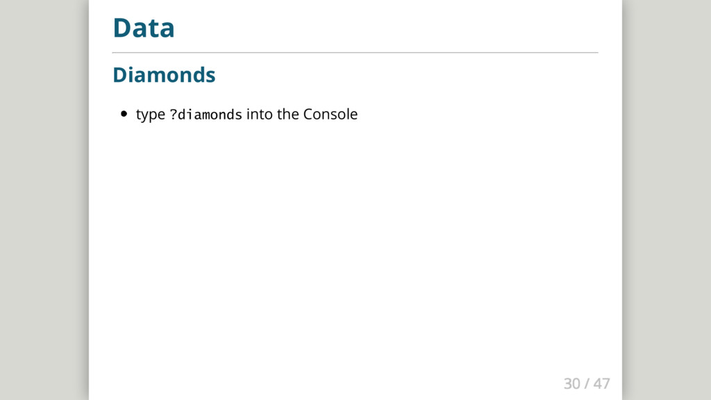 the Console library(gapminder) str(gapminder) ## Classes 'tbl_df', 'tbl' and 'data.frame': 1704 obs. of 6 variables ## $ country : Factor w/ 142 levels "Afghanistan",..: 1 1 1 1 1 1 1 1 1 ## $ continent: Factor w/ 5 levels "Africa","Americas",..: 3 3 3 3 3 3 3 ## $ year : int 1952 1957 1962 1967 1972 1977 1982 1987 1992 1997 . ## $ lifeExp : num 28.8 30.3 32 34 36.1 ... ## $ pop : int 8425333 9240934 10267083 11537966 13079460 14880372 ## $ gdpPercap: num 779 821 853 836 740 ...