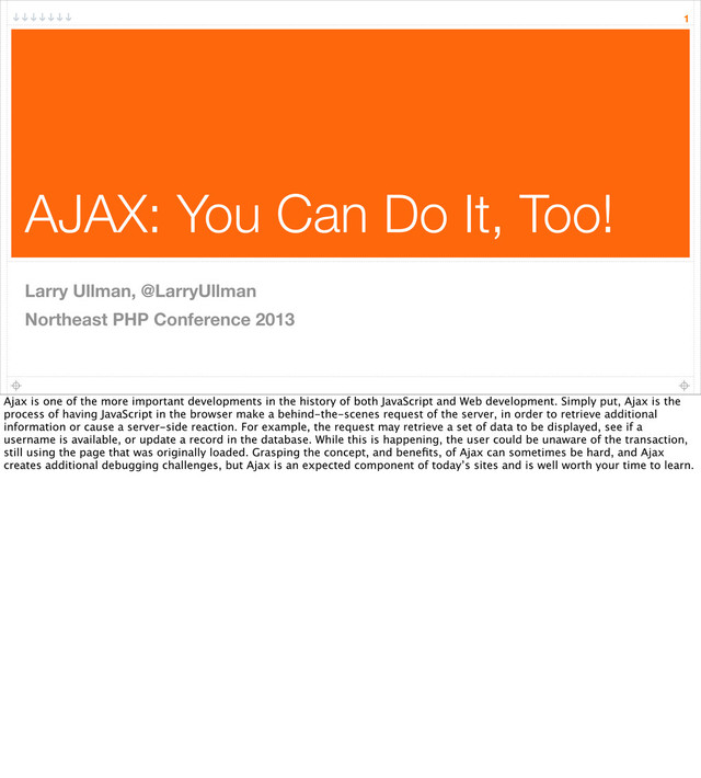 Ajax object created and the response handling function identified, it’s time to perform the actual request. To make an Ajax request, you first call the open() method of the object, providing the type of request to make as the first argument, the URL of the server resource as the second, and the value true as the third. The most common request types are GET and POST. GET requests are the standard method for requesting any HTML page; it’s the type of request a browser makes when you click on a link. Philosophically, GET requests are best used to fetch data. POST requests are the standard method for form submissions (aside from search engine forms, which normally use GET). Philosophically, POST requests are intended to cause a server change or reaction. Put another way, GET is for requests that should be common and repeatable, even bookmarkable; POST is for unique requests, not intended to be repeated, such as the updating of a specific database record or the submission of a contact form (in either case, the general concept will be repeated, but the specifics would differ). Note that the method type should be in all capital letters. The URL can be either absolute or relative , but must be accurate. The third argument to the open() method indicates whether the request should be made asynchronously or synchronously. The default is true, which correlates to asynchronously, but you should explicitly provide it anyway. During asynchronous requests, other JavaScript code can be executed, such as that handling other events, while the JavaScript awaits the server response. In very rare circumstances you will want to perform a synchronous request, as doing so prevents JavaScript from doing anything else while the request is being made and processed, including handling user-based events (you’ll see one practical example of a synchronous request in this chapter). If you were to perform a synchronous request, you wouldn’t create a function to handle readyState changes, as the script waits for the server response before doing anything else anyway. The open() method takes optional fourth and fifth arguments, representing a username and password, respectively. Both would be necessary if the resource is protected by HTTP authentication. However, to use these arguments, you’d need access to those values in your JavaScript code. The only secure way to do that would be to have the user input those values so they are not hardcoded in the page’s source. The final step is to actually send the request, by calling the send() method.