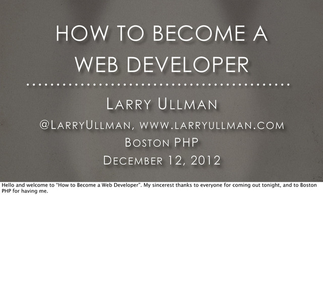 A 90 minute presentation given to Boston PHP that explains how to become a Web developer. In it, I outline the technologies you would need to learn, and in what order, as well as provide the big picture of how these technologies work together. At the end of the presentation, I discuss how to -work- as a Web developer.