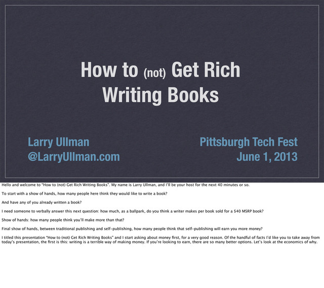 Managing Editor Rewrites Compositor Managing Editor Managing Editor Proofreader Review Compositor Printer To understand the mechanics of writing a book, let’s look at the publishing process. First, you write a chapter and submit it, along with all the images and other materials (e.g., scripts), to your editor. The technical editor will review the chapter for technical accuracy and make comments. A copy or line editor will review the chapter for grammar, punctuation, and clarity, and make edits. The project or managing editor will review the chapter to look at the work of the technical and line editors, plus make sure the writing fits in with the publisher’s style, the series style, etc. (The managing editor takes care of the big picture, including the schedule, payments, and so on.) The chapter is returned to you for rewrites. You rewrite the chapter, taking into account all of the above, as well as any other changes you’ve thought of since you first wrote the chapter. The chapter goes back to the managing editor, who will do a final clean up and pass it to the compositor. The compositor takes the writing, the images, the scripts, etc., and lays it out in proper page formats, adding book styles, page numbers, icons, and so forth. The end result is a PDF that looks like the printed book will look. The managing editor reviews the PDF for any layout issues. The compositing editor reviews the PDF for any layout issues. A proofreader reviews the PDF and fixes any remaining grammar, spelling, or punctuation errors. You review the PDF to catch any last problems and to address any comments or questions raised by the above. The compositor takes into account all the edits and outputs a second version of the PDF. The managing editor, the compositing editor, and you all review the PDF for any issues at all, and to make sure that the previous issues all got fixed. The compositor takes into account all the edits and outputs a third and final version of the PDF. Once all the PDFs are done, they’re sent, along with the PDF of the cover, plus the PDFs of the book’s other materials—copyright, table of contents, index, and so forth—to the printer.