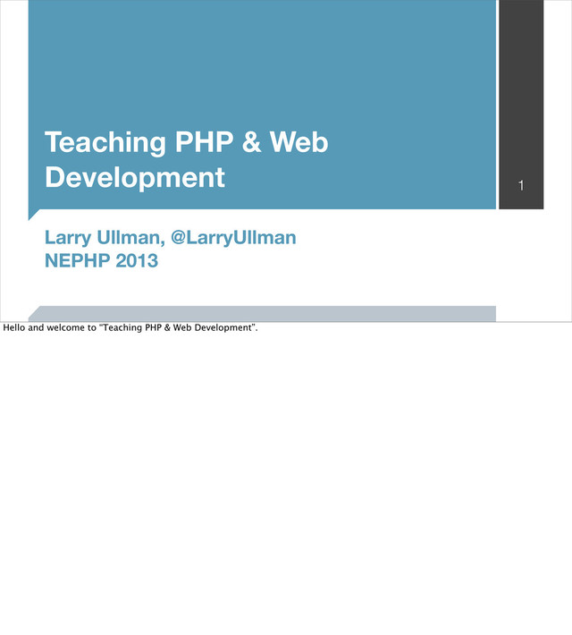 This presentation explains the process, and some of the tough decisions you have to make, to teach PHP and Web development. First given at Northeast PHP 2013, in Boston.