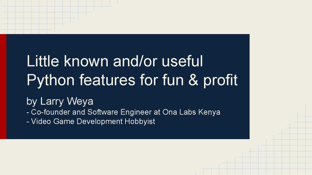 python installations on the same system, each with its own set of packages. Invaluable in any python dev machine. virtualenv - http://www.virtualenv.org/en/latest/ virtualenvwrapper - http://virtualenvwrapper.readthedocs.org/en/latest/index. html Make using virtualenv even easier. • Central location of all virtual environments • switch virtual environments with the `workon` command, includes TAB completion
