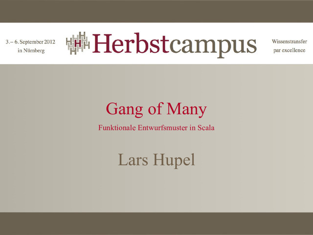 der Compiler nach Implicits? Scala Language Specification §7.2 1. importierte Bezeichner 2. aus den Companions von: bei einem Typen T[A, B, C, ...]: T, A, B, ... bei einem Typen A with B with ...: A, B, ... Lars Hupel Gang of Many 4. September 2012 12 / 58