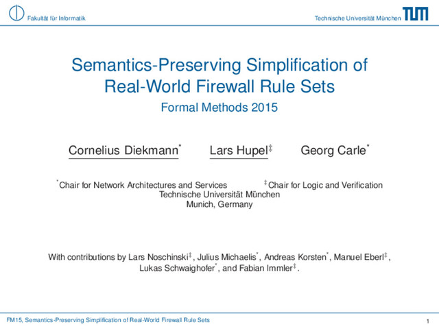 Cornelius Diekmann, Lars Hupel, Georg Carle: Semantics-Preserving Simplification of Real-World Firewall Rule Sets