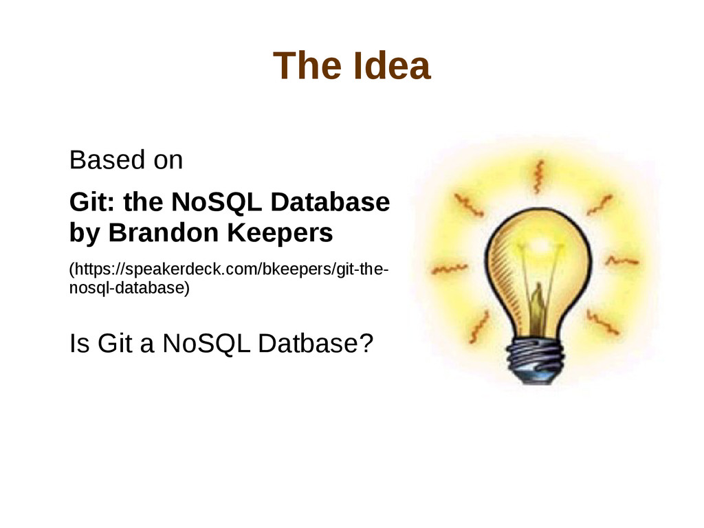 Keepers (https://speakerdeck.com/bkeepers/git-the- nosql-database) Is Git a NoSQL Datbase?