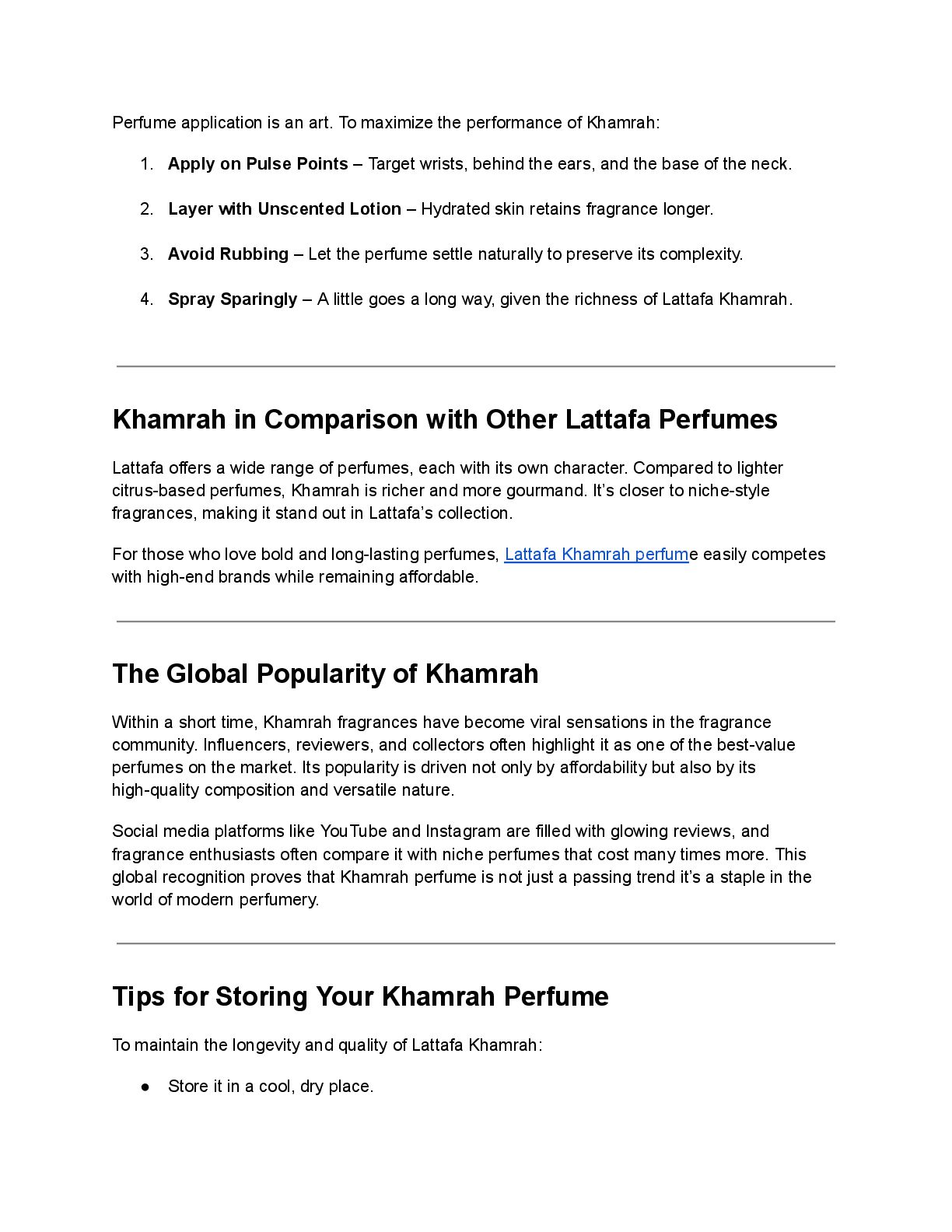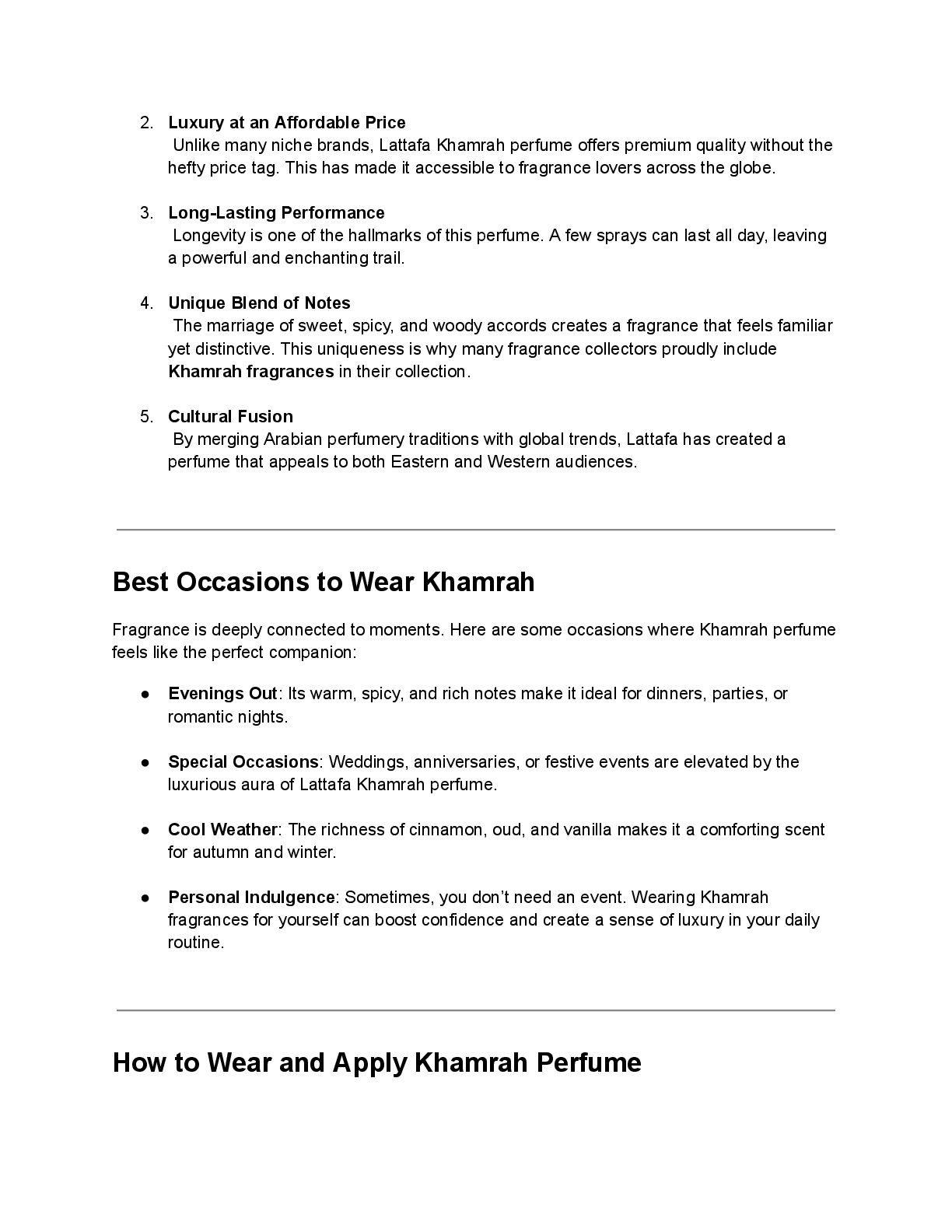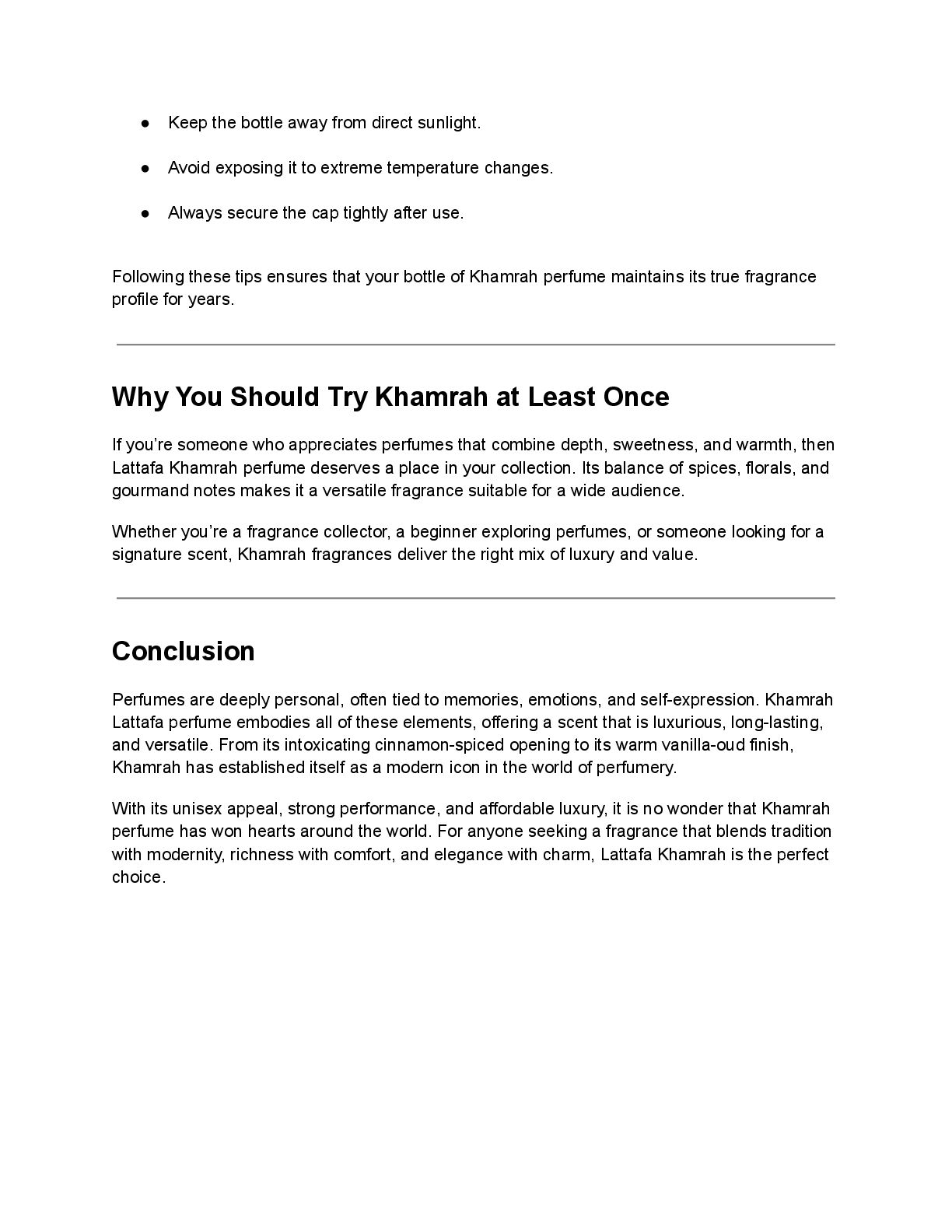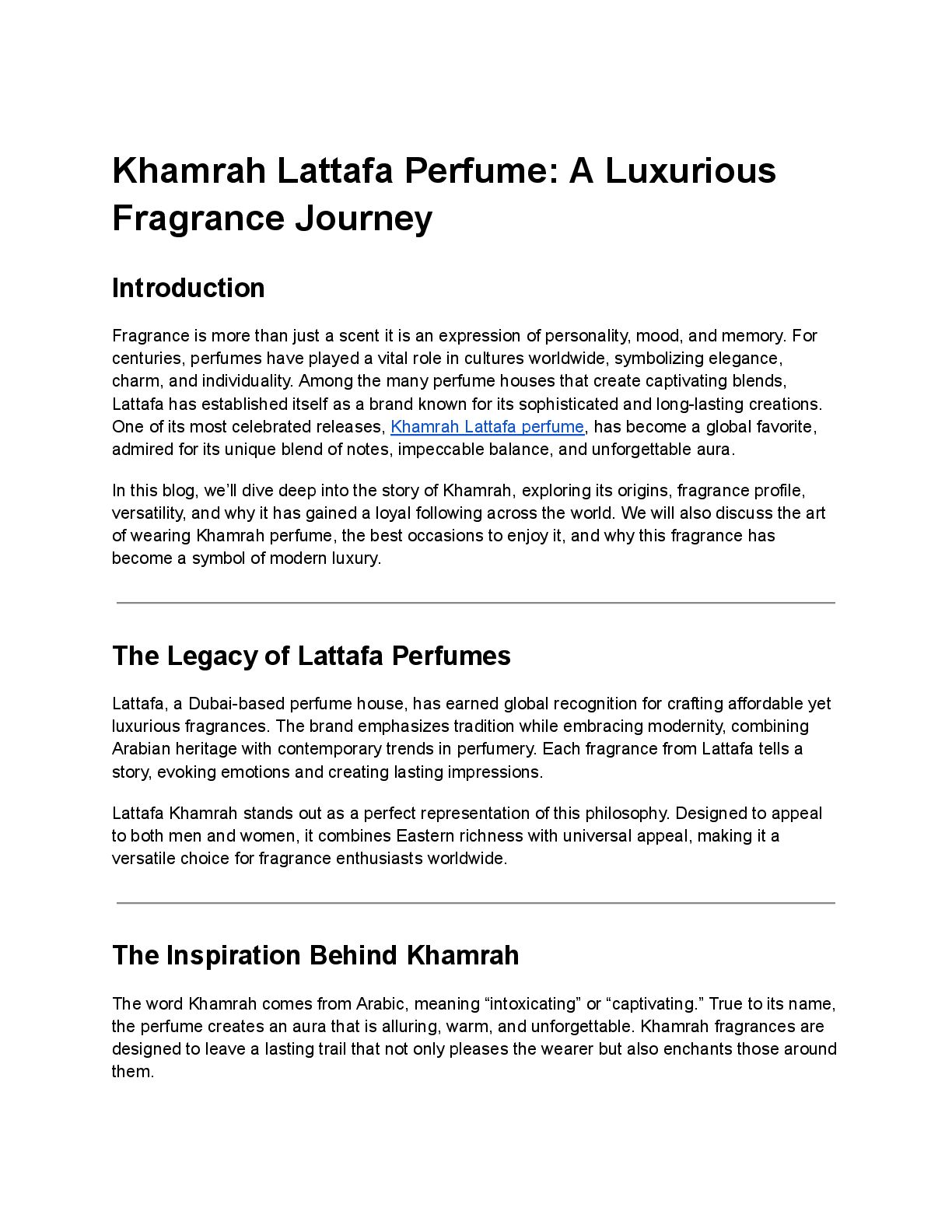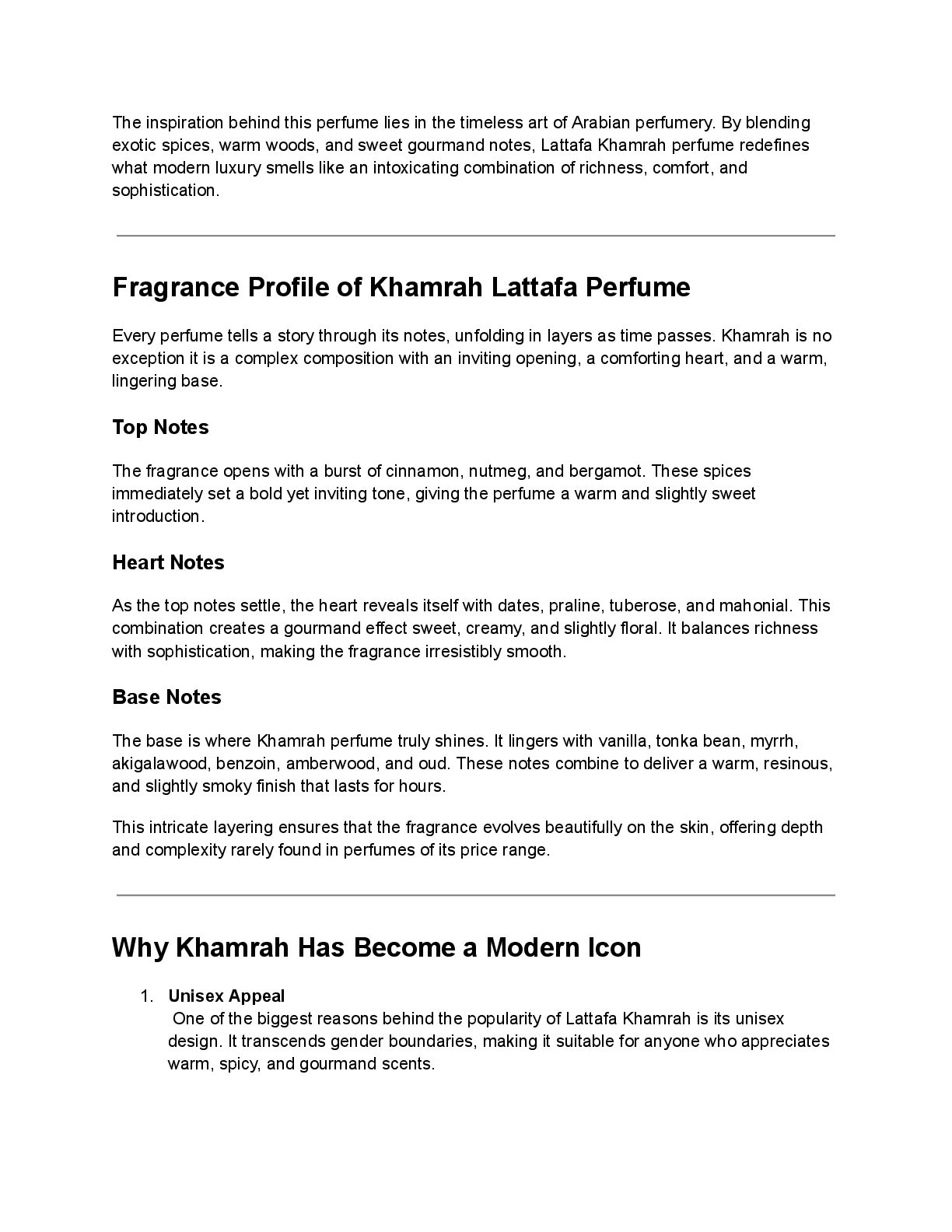 of Arabian perfumery. By blending exotic spices, warm woods, and sweet gourmand notes, Lattafa Khamrah perfume redefines what modern luxury smells like an intoxicating combination of richness, comfort, and sophistication. Fragrance Profile of Khamrah Lattafa Perfume Every perfume tells a story through its notes, unfolding in layers as time passes. Khamrah is no exception it is a complex composition with an inviting opening, a comforting heart, and a warm, lingering base. Top Notes The fragrance opens with a burst of cinnamon, nutmeg, and bergamot. These spices immediately set a bold yet inviting tone, giving the perfume a warm and slightly sweet introduction. Heart Notes As the top notes settle, the heart reveals itself with dates, praline, tuberose, and mahonial. This combination creates a gourmand effect sweet, creamy, and slightly floral. It balances richness with sophistication, making the fragrance irresistibly smooth. Base Notes The base is where Khamrah perfume truly shines. It lingers with vanilla, tonka bean, myrrh, akigalawood, benzoin, amberwood, and oud. These notes combine to deliver a warm, resinous, and slightly smoky finish that lasts for hours. This intricate layering ensures that the fragrance evolves beautifully on the skin, offering depth and complexity rarely found in perfumes of its price range. Why Khamrah Has Become a Modern Icon 1. Unisex Appeal One of the biggest reasons behind the popularity of Lattafa Khamrah is its unisex design. It transcends gender boundaries, making it suitable for anyone who appreciates warm, spicy, and gourmand scents.
