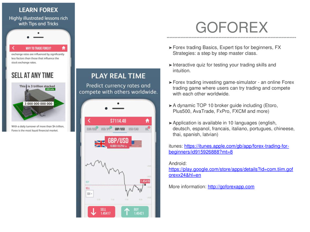 a step by step master class. ➤Interactive quiz for testing your trading skills and intuition. ➤Forex trading investing game-simulator - an online Forex trading game where users can try trading and compete with each other worldwide. ➤A dynamic TOP 10 broker guide including (Etoro, Plus500, AvaTrade, FxPro, FXCM and more) ➤Application is available in 10 languages (english, deutsch, espanol, francais, italiano, portugues, chineese, thai, spanish, latvian) itunes: https://itunes.apple.com/gb/app/forex-trading-for- beginners/id915926888?mt=8 Android: https://play.google.com/store/apps/details?id=com.tiim.gof orexx24&hl=en More information: http://goforexapp.com
