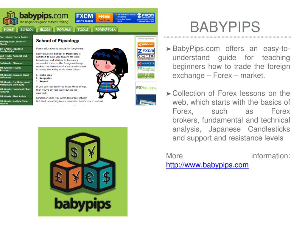 beginners how to trade the foreign exchange – Forex – market. ➤ Collection of Forex lessons on the web, which starts with the basics of Forex, such as Forex brokers, fundamental and technical analysis, Japanese Candlesticks and support and resistance levels More information: http://www.babypips.com